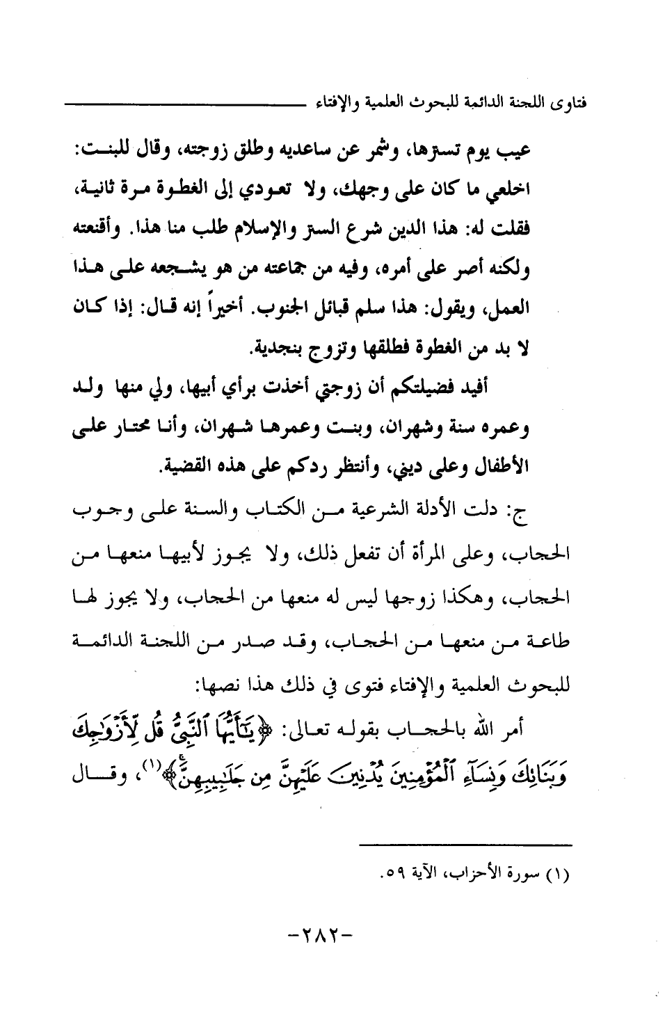 ج: دلت الأدلة الشرعية من الكتاب والسنة على وجوب الحجاب، وعلى المرأة أن تفعل ذلك، ولا يجوز لأبيها منعها من الحجاب، وهكذا زوجها ليس له منعها من الحجاب، ولا يجوز لها طاعة من منعها من الحجاب، وقد صدر من اللجنة الدائمة للبحوث العلمية والإفتاء فتوى في ذلك هذا نصها: أمر الله بالحجاب بقوله تعالى: {يَا أَيُّهَا النَّبِيُّ قُلْ لِأَزْوَاجِكَ وَبَنَاتِكَ وَنِسَاءِ الْمُؤْمِنِينَ يُدْنِينَ عَلَيْهِنَّ مِنْ جَلَابِيبِهِنَّ} (¬1) وقال