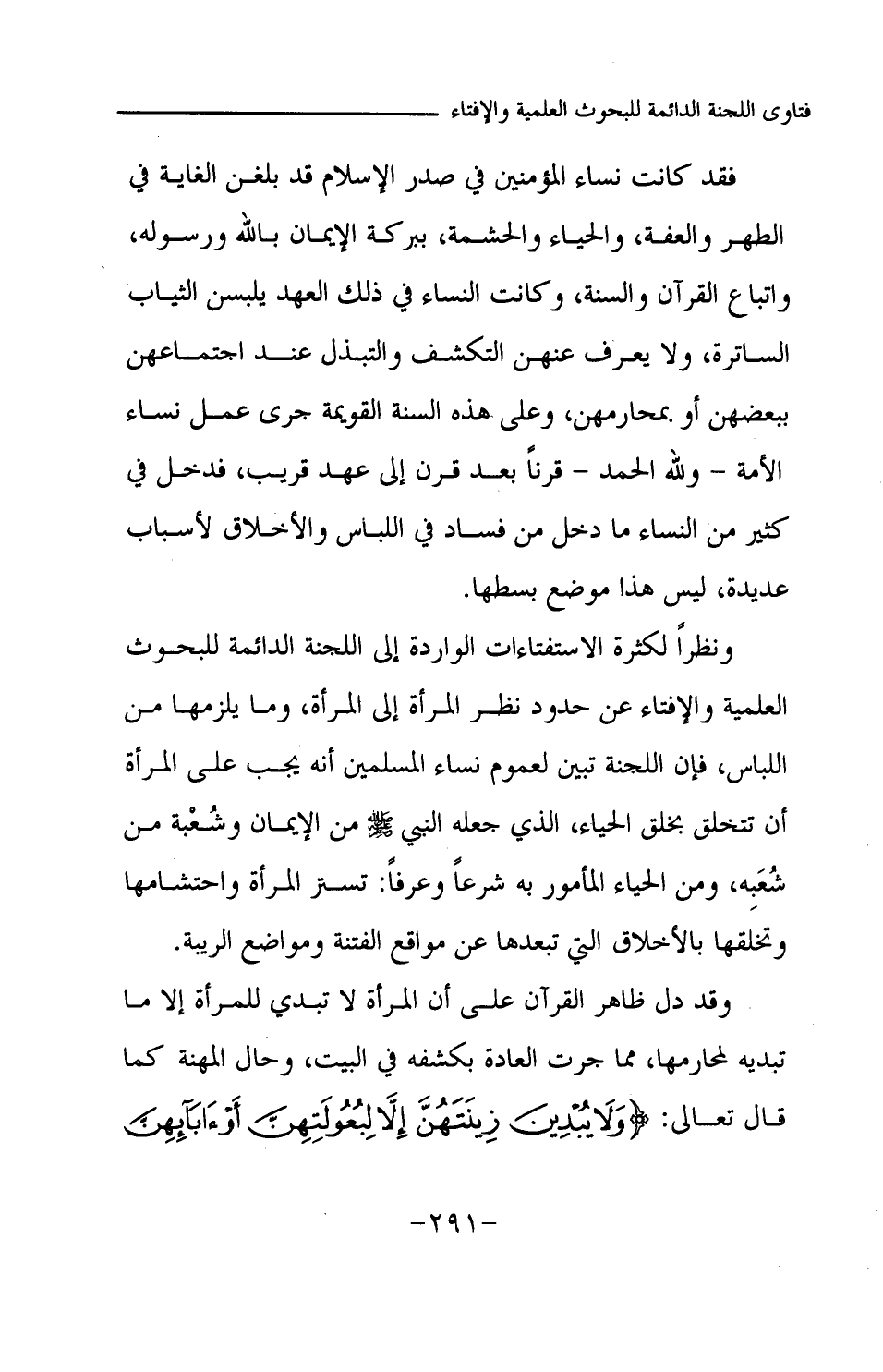 فقد كانت نساء المؤمنين في صدر الإسلام قد بلغن الغاية في الطهر والعفة، والحياء والحشمة، ببركة الإيمان بالله ورسوله، واتباع القرآن والسنة، وكانت النساء في ذلك العهد يلبسن الثياب الساترة، ولا يعرف عنهن التكشف والتبذل عند اجتماعهن ببعضهن أو بمحارمهن، وعلى هذه السنة القويمة جرى عمل نساء الأمة- ولله الحمد- قرنا بعد قرن إلى عهد قريب، فدخل في كثير من النساء ما دخل من فساد في اللباس والأخلاق لأسباب عديدة، ليس هذا موضع بسطها. ونظرا لكثرة الاستفتاءات الواردة إلى اللجنة الدائمة للبحوث العلمية والإفتاء عن حدود نظر المرأة إلى المرأة، وما يلزمها من اللباس، فإن اللجنة تبين لعموم نساء المسلمين أنه يجب على المرأة أن تتخلق بخلق الحياء، الذي جعله النبي -صلى الله عليه وسلم- من الإيمان وشعبة من شعبه، ومن الحياء المأمور به شرعا وعرفا: تستر المرأة واحتشامها وتخلقها بالأخلاق التي تبعدها عن مواقع الفتنة ومواضع الريبة. وقد دل ظاهر القرآن على أن المرأة لا تبدي للمرأة إلا ما تبديه لمحارمها، مما جرت العادة بكشفه في البيت، وحال المهنة كما قال تعالى: