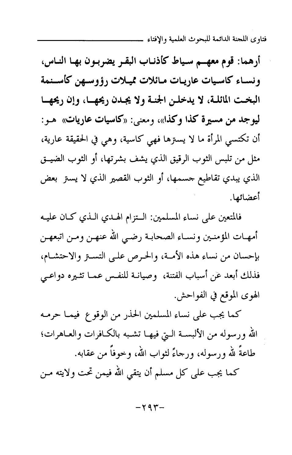 أرهما: قوم معهم سياط كأذناب البقر يضربون بها الناس، ونساء كاسيات عاريات مائلات مميلات رؤوسهن كأسنمة البخت المائلة، لا يدخلن الجنة ولا يجدن ريحها، وإن ريحها ليوجد من مسيرة كذا وكذا (¬1) » ومعنى: "كاسيات عاريات" هو: أن تكتسي المرأة ما لا يسترها فهي كاسية، وهي في الحقيقة عارية، مثل من تلبس الثوب الرقيق الذي يشف بشرتها، أو الثوب الضيق الذي يبدي تقاطيع جسمها، أو الثوب القصير الذي لا يستر بعض أعضائها. فالمتعين على نساء المسلمين: التزام الهدي الذي كان عليه أمهات المؤمنين ونساء الصحابة رضي الله عنهن ومن اتبعهن بإحسان من نساء هذه الأمة، والحرص على التستر والاحتشام، فذلك أبعد عن أسباب الفتنة، وصيانة للنفس عما تثيره دواعي الهوى الموقع في الفواحش. كما يجب على نساء المسلمين الحذر من الوقوع فيما حرمه الله ورسوله من الألبسة التي فيها تشبه بالكافرات والعاهرات؛ طاعة لله ورسوله، ورجاء لثواب الله، وخوفا من عقابه. كما يجب على كل مسلم أن يتقي الله فيمن تحت ولايته من