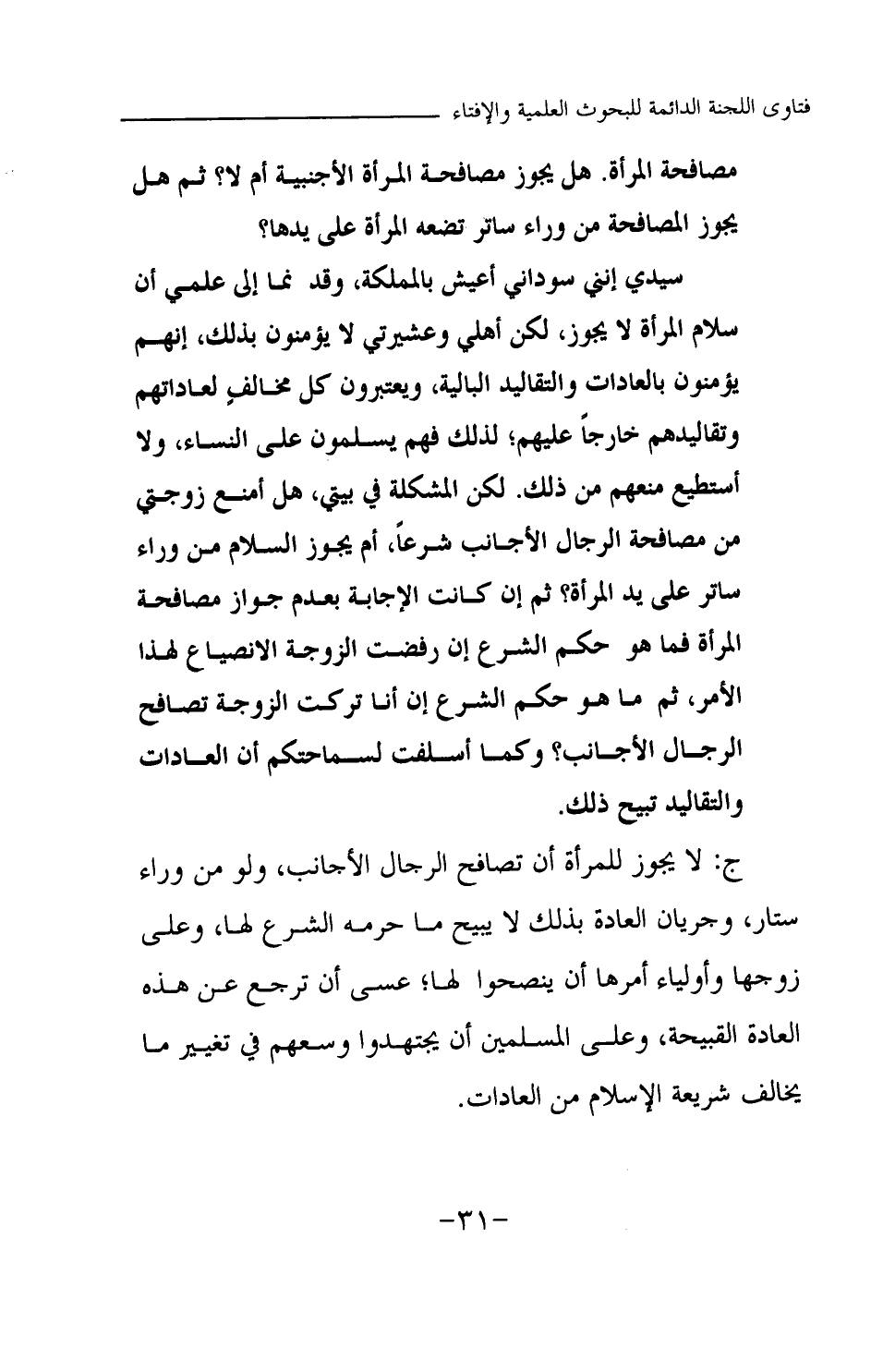 لكن المشكلة في بيتي، هل أمنع زوجتي من مصافحة الرجال الأجانب شرعا، أم يجوز السلام من وراء ساتر على يد المرأة؟ ثم إن كانت الإجابة بعدم جواز مصافحة المرأة فما هو حكم الشرع إن رفضت الزوجة الانصياع لهذا الأمر، ثم ما هو حكم الشرع إن أنا تركت الزوجة تصافح الرجال الأجانب؟ وكما أسلفت لسماحتكم أن العادات والتقاليد تبيح ذلك.