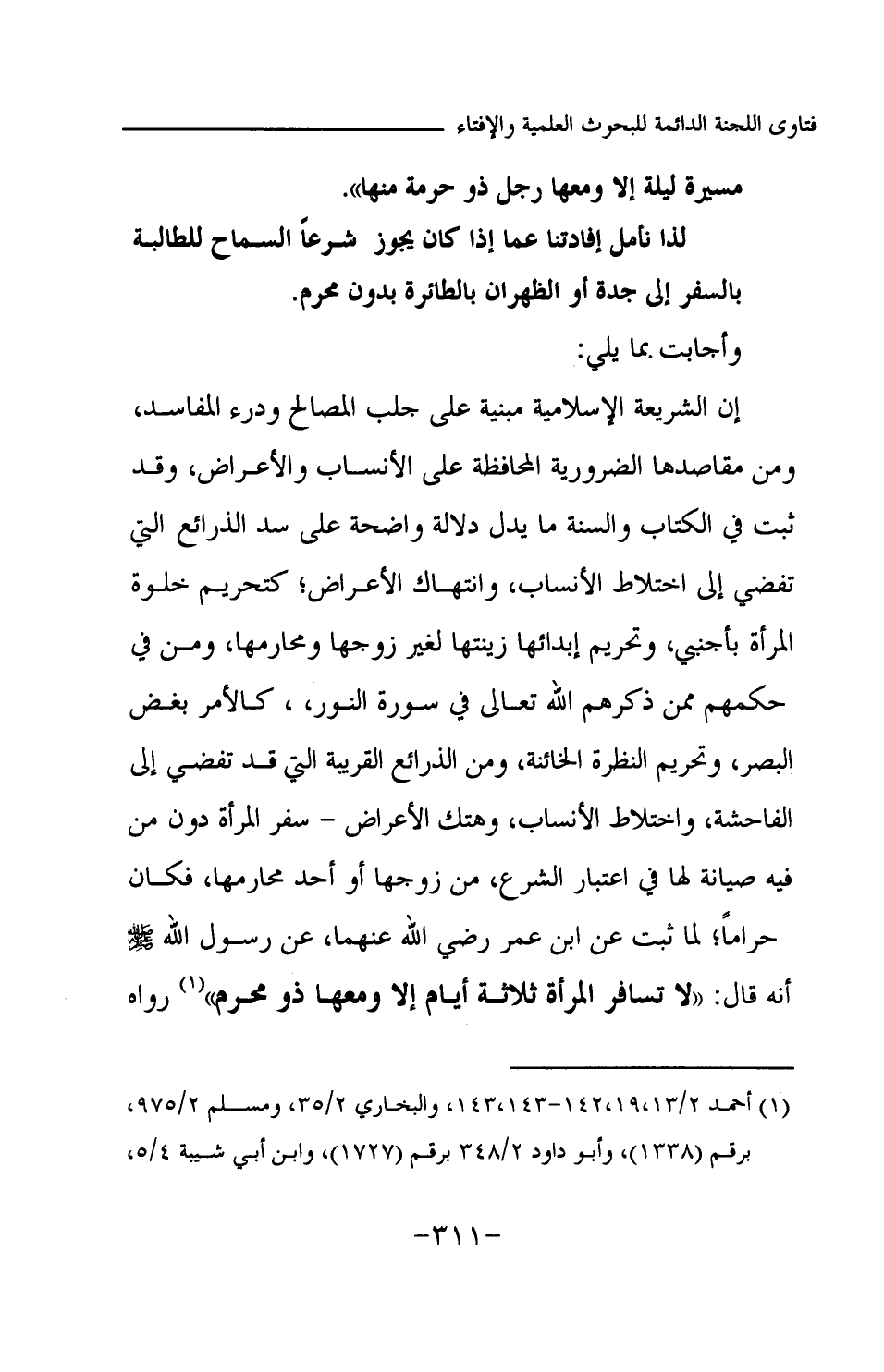 وأجابت بما يلي: إن الشريعة الإسلامية مبنية على جلب المصالح ودرء المفاسد، ومن مقاصدها الضرورية المحافظة على الأنساب والأعراض، وقد ثبت في الكتاب والسنة ما يدل دلالة واضحة على سد الذرائع التي تفضي إلى اختلاط الأنساب، وانتهاك الأعراض: كتحريم خلوة المرأة بأجنبي، وتحريم إبدائها زينتها لغير زوجها ومحارمها، ومن في حكمهم بمن ذكرهم الله تعالى في سوره النور: كالأمر بغض البصر، وتحريم النظرة الخائنة، ومن الذرائع القريبة التي قد تفضي إلى الفاحشة، واختلاط الأنساب، وهتك الأعراض - سفر المرأة دون من فيه صيانة لها في اعتبار الشرع، من زوجها أو أحد محارمها، فكان حراما؛ لما ثبت عن ابن عمر رضي الله عنهما، عن رسول الله -صلى الله عليه وسلم- أنه قال: «لا تسافر المرأة ثلاثة أيام إلا ومعها ذو محرم (¬2) » رواه