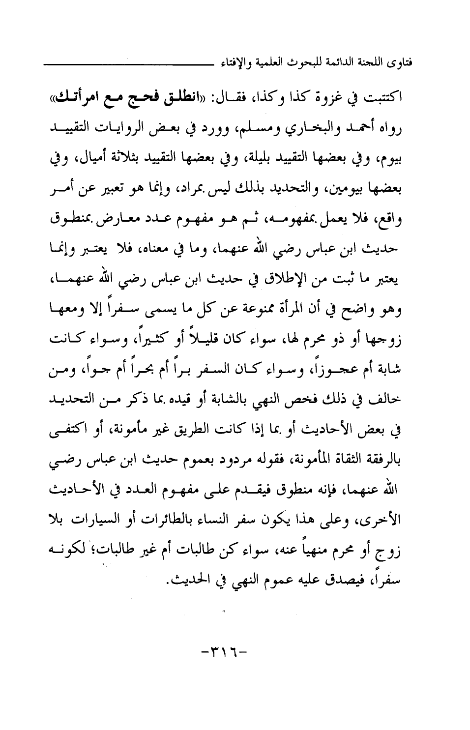 اكتتبت في غزوة كذا وكذا. فقال: انطلق فحج مع امرأتك (¬1) » رواه أحمد والبخاري ومسلم. وورد في بعض الروايات التقييد بيوم، وفي بعضها التقييد بليلة، وفي بعضها التقييد بثلاثة أميال، وفي بعضها بيومين، والتحديد بذلك ليس بمراد، وإنما هو تعبير عن أمر واقع فلا يعمل بمفهومه، ثم هو مفهوم عدد معارض بمنطوق حديث ابن عباس رضي الله عنهما، وما في معناه، فلا يعتبر وإنما يعتبر ما ثبت من الإطلاق في حديث ابن عباس رضي الله عنهما، وهو واضح في أن المرأة ممنوعة عن كل ما يسمى سفرا إلا ومعها زوجها أو ذو محرم لها، سواء كان قليلا أو كثيرا، وسواء كانت شابة أم عجوزا، وسواء كان السفر برا أم بحرا أم جوا، ومن خالف في ذلك فخص النهي بالشابة أو قيده بما ذكر من التحديد في بعض الأحاديث أو بما إذا كانت الطريق غير مأمونة، أو اكتفى بالرفقة الثقات المأمونة، فقوله مردود بعموم حديث ابن عباس رضي الله عنهما، فإنه منطوق فيقدم على مفهوم العدد في الأحاديث الأخرى، وعلى هذا يكون سفر النساء بالطائرات أو السيارات بلا زوج أو محرم منهيا عنه، سواء كن طالبات أم غير طالبات؛ لكونه سفرا، فيصدق عليه عموم النهي في الحديث.
