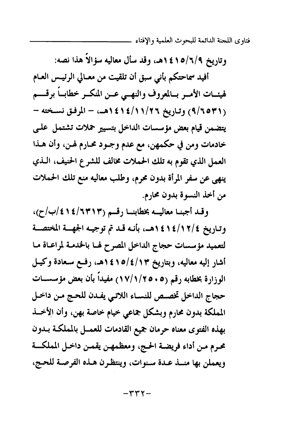 وقد أجبنا معاليه بخطابنا رقم 6313 \ 414 \ ب \ ح) ، وتاريخ 4 \ 12 \ 1414هـ، بأنه قد تم توجيه الجهة المختصة لتعميد مؤسسات حجاج الداخل المصرح لها بالخدمة لمراعاة ما أشار إليه معاليه، وبتاريخ 13 \ 4 \ 1415هـ، رفع سعادة وكيل الوزارة بخطابه رقم (2505 \ 1 \ 17) مفيدا بأن بعض مؤسسات حجاج الداخل تخصص للنساء اللاتي يفدن للحج من داخل المملكة بدون محارم وبشكل جماعي خياما خاصة بهن، وأن الأخذ بهذه الفتوى معناه حرمان جميع القادمات للعمل بالمملكة بدون محرم من أداء فريضة الحج، ومعظمهن يقمن داخل المملكة ويعملن بها منذ عدة سنوات، وينتظرن هذه الفرصة للحج،