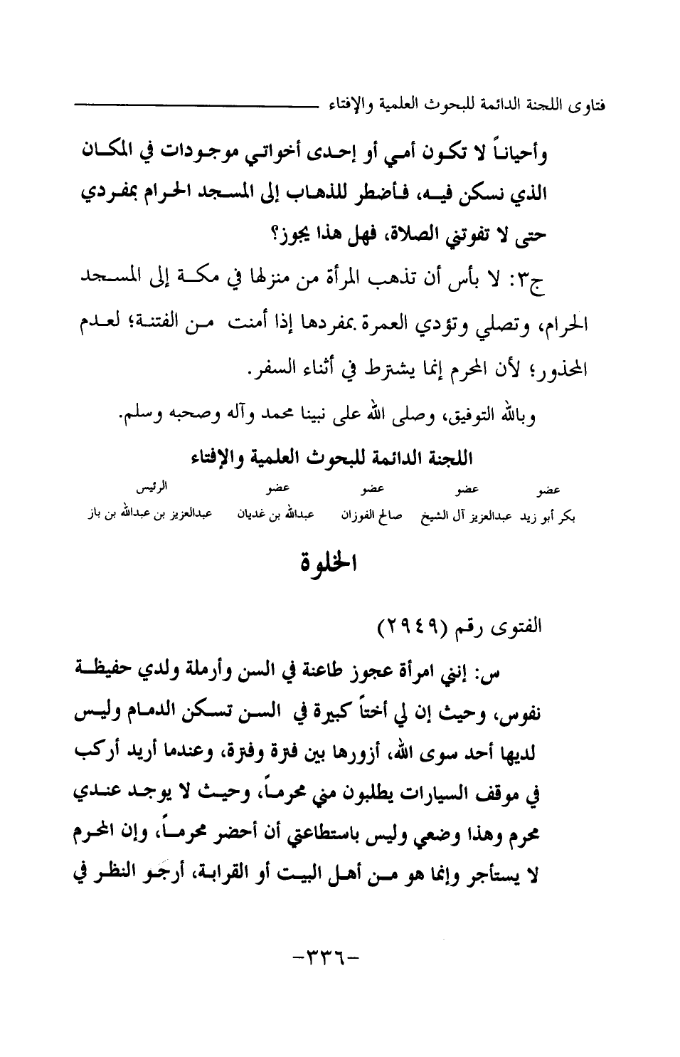 ج3: لا بأس أن تذهب المرأة من منزلها في مكة إلى المسجد الحرام، وتصلي وتؤدي العمرة بمفردها إذا أمنت من الفتنة؛ لعدم المحذور؛ لأن المحرم إنما يشترط في أثناء السفر. وبالله التوفيق، وصلى الله على نبينا محمد وآله وصحبه وسلم.