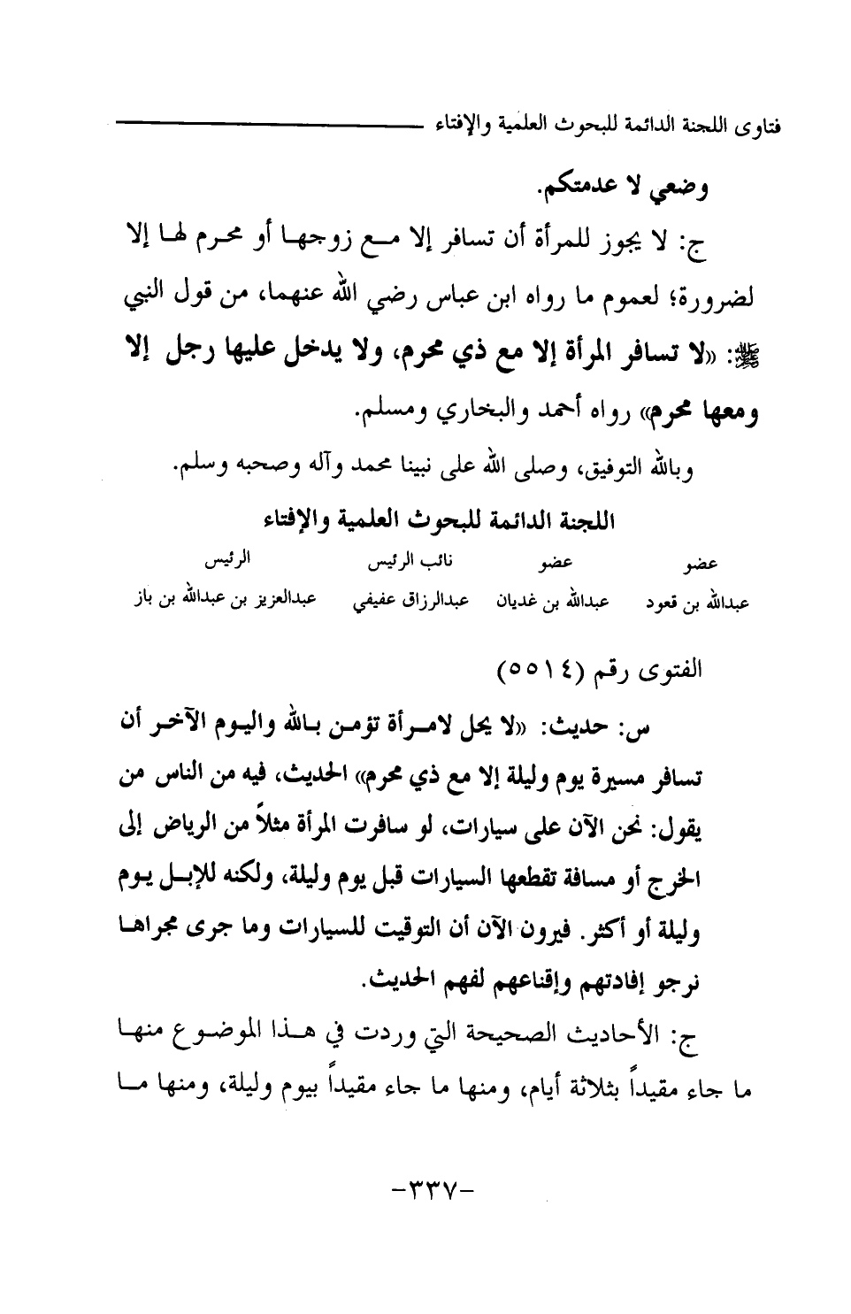 ج: لا يجوز للمرأة أن تسافر إلا مع زوجها أو محرم لها إلا لضرورة؛ لعموم ما رواه ابن عباس رضي الله عنهما، من قول النبي -صلى الله عليه وسلم-: «لا تسافر المرأة إلا مع ذي محرم، ولا يدخل عليها رجل إلا ومعها محرم (¬1) » رواه أحمد والبخاري ومسلم. وبالله التوفيق، وصلى الله على نبينا محمد وآله وصحبه وسلم.