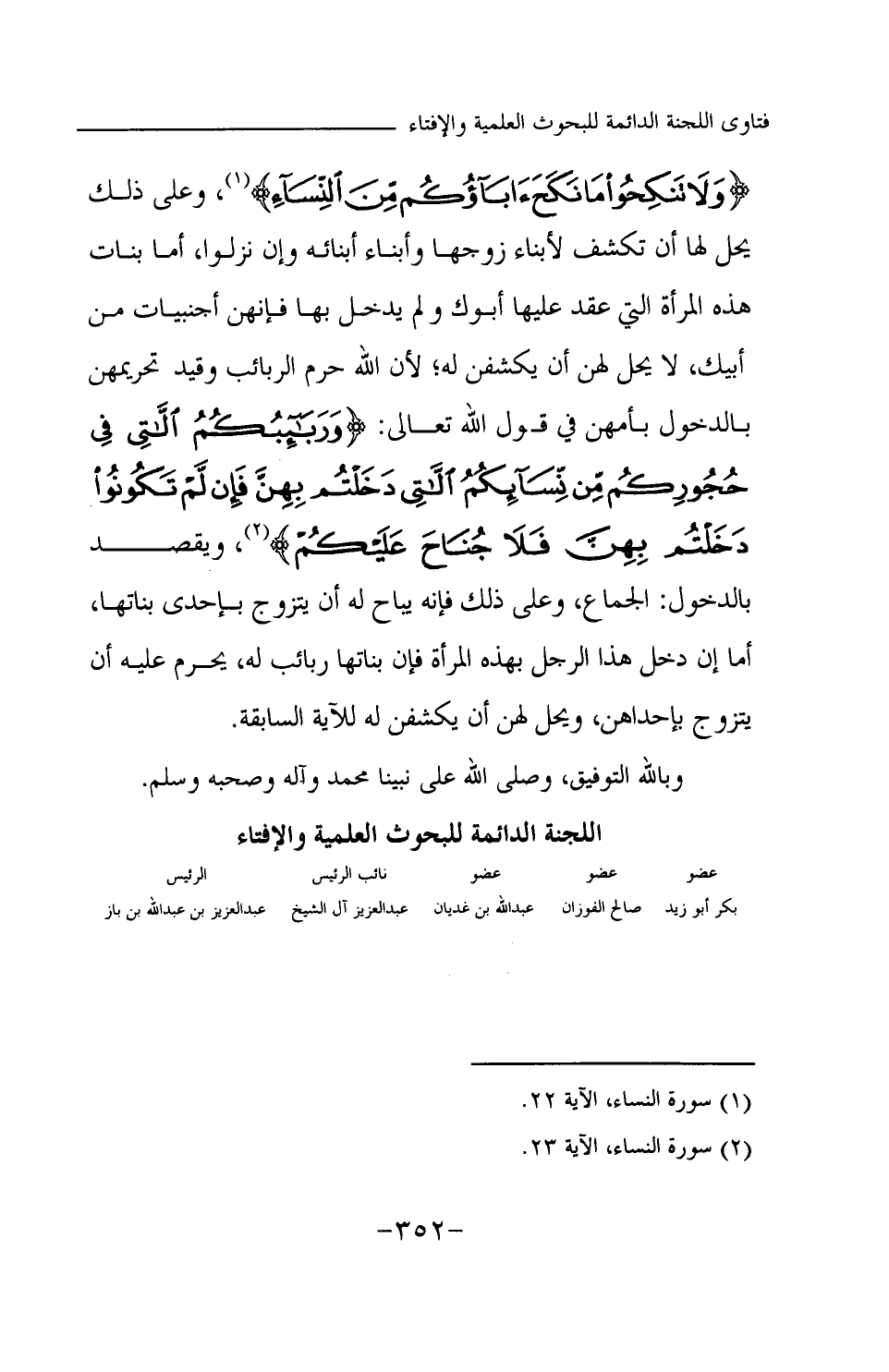 {وَلَا تَنْكِحُوا مَا نَكَحَ آبَاؤُكُمْ مِنَ النِّسَاءِ} (¬1) وعلى ذلك يحل لها أن تكشف لأبناء زوجها وأبناء أبنائه وإن نزلوا، أما بنات هذه المرأة التي عقد عليها أبوك ولم يدخل بها فإنهن أجنبيات من أبيك، لا يحل لهن أن يكشفن له؛ لأن الله حرم الربائب وقيد تحريمهن بالدخول بأمهن في قول الله تعالى: {وَرَبَائِبُكُمُ اللَّاتِي فِي حُجُورِكُمْ مِنْ نِسَائِكُمُ اللَّاتِي دَخَلْتُمْ بِهِنَّ فَإِنْ لَمْ تَكُونُوا دَخَلْتُمْ بِهِنَّ فَلَا جُنَاحَ عَلَيْكُمْ} (¬2) ويقصد بالدخول: الجماع. وعلى ذلك فإنه يباح له أن يتزوج بإحدى بناتها، أما إن دخل هذا الرجل بهذه المرأة فإن بناتها ربائب له، يحرم عليه أن يتزوج بإحداهن، ويحل لهن أن يكشفن له للآية السابقة. وبالله التوفيق، وصلى الله على نبينا محمد وآله وصحبه وسلم.
