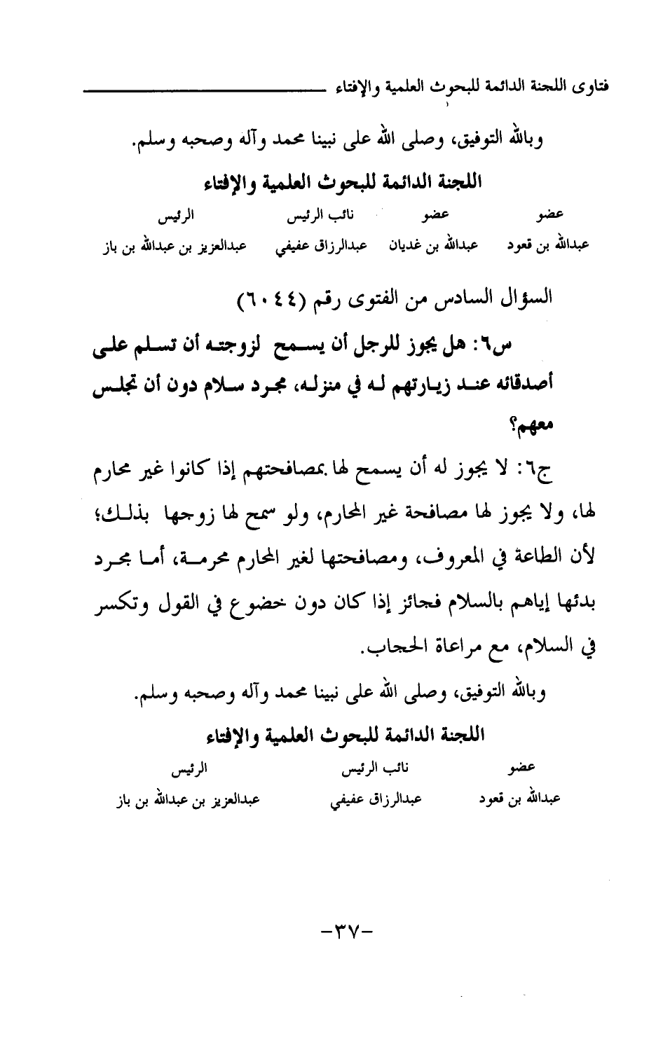 س6: هل يجوز للرجل أن يسمح لزوجته أن تسلم على أصدقائه عند زيارتهم له في منزله، مجرد سلام دون أن تجلس معهم؟