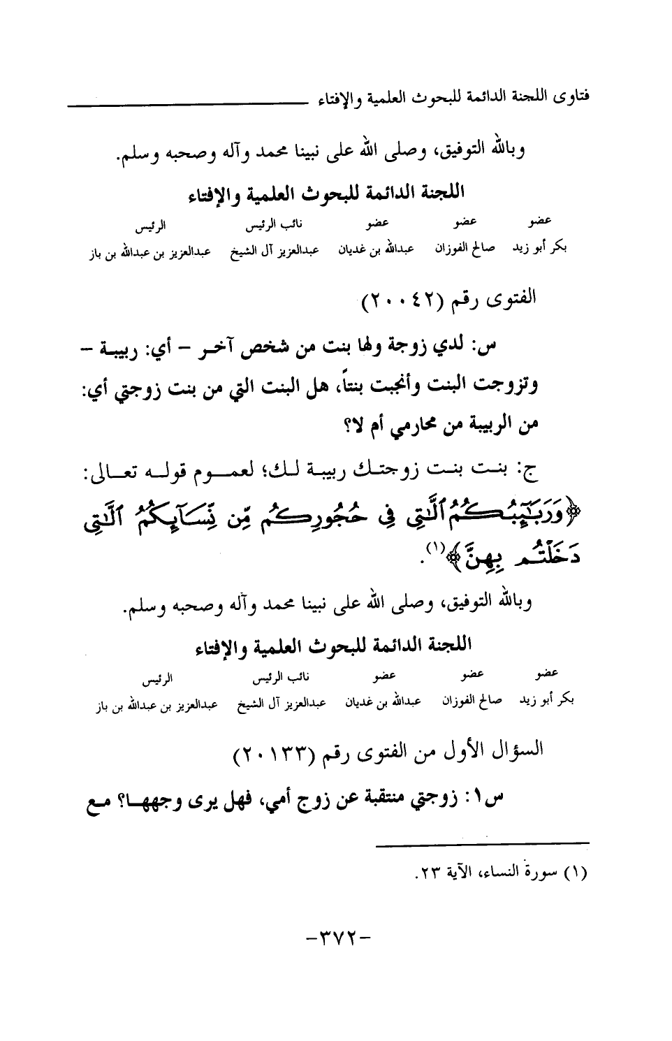ج: بنت بنت زوجتك ربيبة لك؛ لعموم قوله تعالى: {وَرَبَائِبُكُمُ اللَّاتِي فِي حُجُورِكُمْ مِنْ نِسَائِكُمُ اللَّاتِي دَخَلْتُمْ بِهِنَّ} (¬1) وبالله التوفيق، وصلى الله على نبينا محمد وآله وصحبه وسلم.