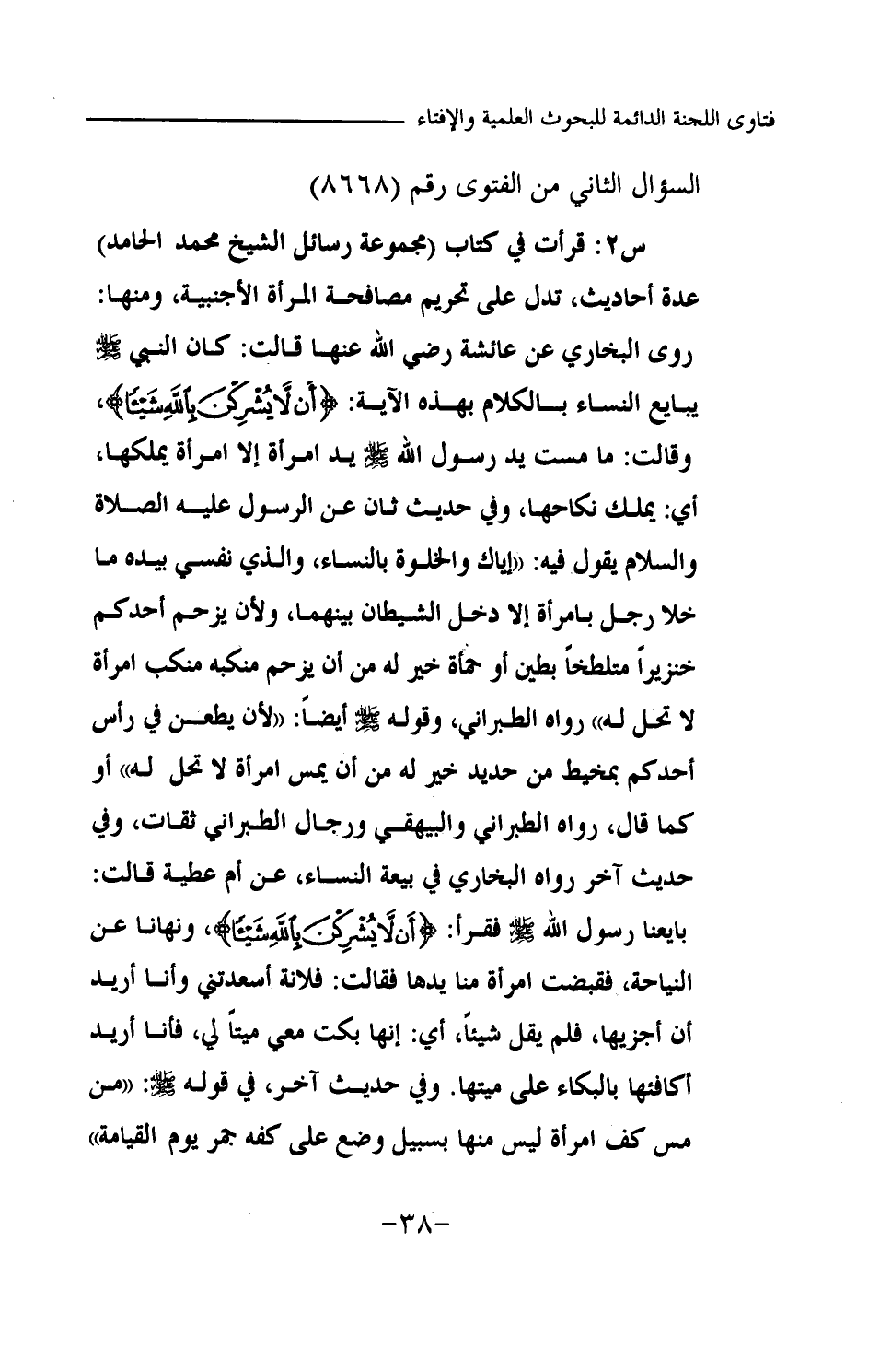 س2: قرأت في كتاب (مجموعة رسائل الشيخ محمد الحامد) عدة أحاديث، تدل على تحريم مصافحة المرأة الأجنبية، ومنها: روى البخاري عن عائشة رضي الله عنها قالت: «كان النبي -صلى الله عليه وسلم- يبايع النساء بالكلام بهذه الآية: وقالت: ما مست يد رسول الله -صلى الله عليه وسلم- يد امرأة إلا امرأة يملكها، أي: يملك نكاحها (¬2) » . وفي حديث ثان عن الرسول عليه الصلاة والسلام يقول فيه: «إياك والخلوة بالنساء، والذي نفسي بيده ما خلا رجل بامرأة إلا دخل الشيطان بينهما، ولأن يزحم أحدكم خنزيرا متلطخا بطين أو حمأة خير له من أن يزحم منكبه منكب امرأة لا تحل له» رواه الطبراني. وقوله -صلى الله عليه وسلم- أيضا: «لأن يطعن في رأس أحدكم بمخيط من حديد خير له من أن يمس امرأة لا تحل له (¬3) » أو كما قال، رواه الطبراني والبيهقي ورجال الطبراني ثقات. وفي حديث آخر رواه البخاري في بيعة النساء، عن أم عطية قالت: «بايعنا رسول الله -صلى الله عليه وسلم- فقرأ: ونهانا عن النياحة، فقبضت امرأة منا يدها فقالت: فلانة أسعدتني وأنا أريد أن أجزيها، فلم يقل شيئا، أي: إنها بكت معي ميتا لي، فأنا أريد أكافئها بالبكاء على ميتها (¬5) » . وفي حديث آخر، في قوله -صلى الله عليه وسلم-: «من مس كف امرأة ليس منها بسبيل وضع على كفه جمر يوم القيامة»