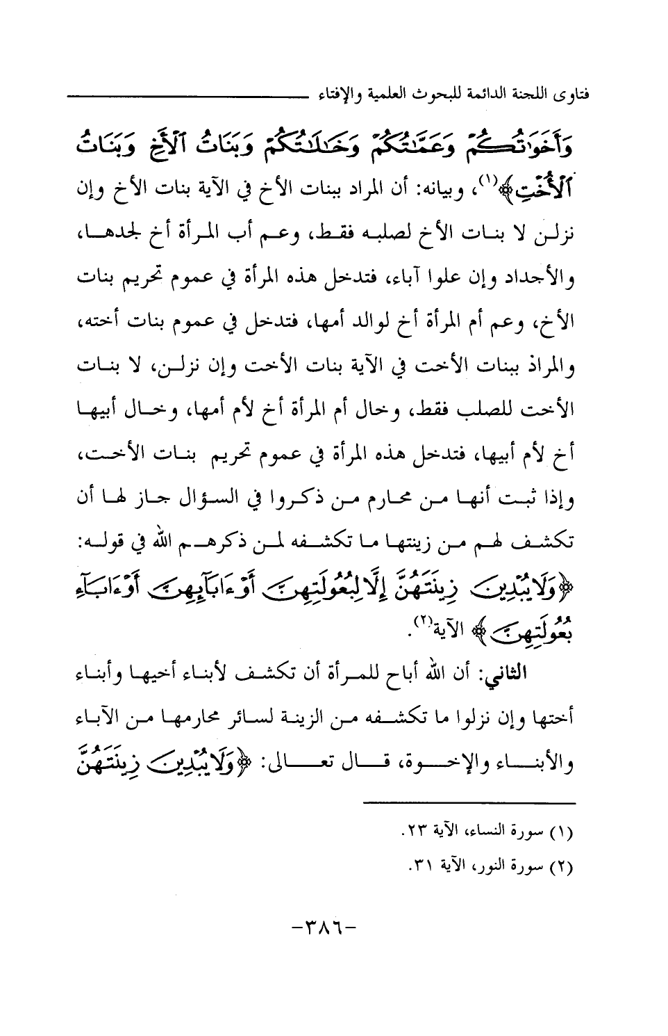 وبيانه: أن المراد ببنات الأخ في الآية بنات الأخ وإن نزلن لا بنات الأخ لصلبه فقط، وعم أبي المرأة أخ لجدها، والأجداد وإن علوا آباء، فتدخل هذه المرأة في عموم تحريم بنات الأخ، وعم أم المرأة أخ لوالد أمها، فتدخل في عموم بنات أخته، والمراد ببنات الأخت في الآية بنات الأخت وإن نزلن، لا بنات الأخت للصلب فقط، وخال أم المرأة أخ لأم أمها، وخال أبيها أخ لأم أبيها، فتدخل هذه المرأة في عموم تحريم بنات الأخت، وإذا ثبت أنها من محارم من ذكروا في السؤال جاز لها أن تكشف لهم من زينتها ما تكشفه لمن ذكرهم الله في قوله: {وَلَا يُبْدِينَ زِينَتَهُنَّ إِلَّا لِبُعُولَتِهِنَّ أَوْ آبَائِهِنَّ أَوْ آبَاءِ بُعُولَتِهِنَّ} (¬1) الآية. الثاني: أن الله أباح للمرأة أن تكشف لأبناء أخيها وأبناء أختها وإن نزلوا ما تكشفه من الزينة لسائر محارمها من الآباء والأبناء والإخوة، قال تعالى: {وَلَا يُبْدِينَ زِينَتَهُنَّ إِلَّا لِبُعُولَتِهِنَّ أَوْ آبَائِهِنَّ أَوْ آبَاءِ بُعُولَتِهِنَّ أَوْ أَبْنَائِهِنَّ أَوْ أَبْنَاءِ بُعُولَتِهِنَّ أَوْ إِخْوَانِهِنَّ أَوْ بَنِي إِخْوَانِهِنَّ} (¬2) الآية،