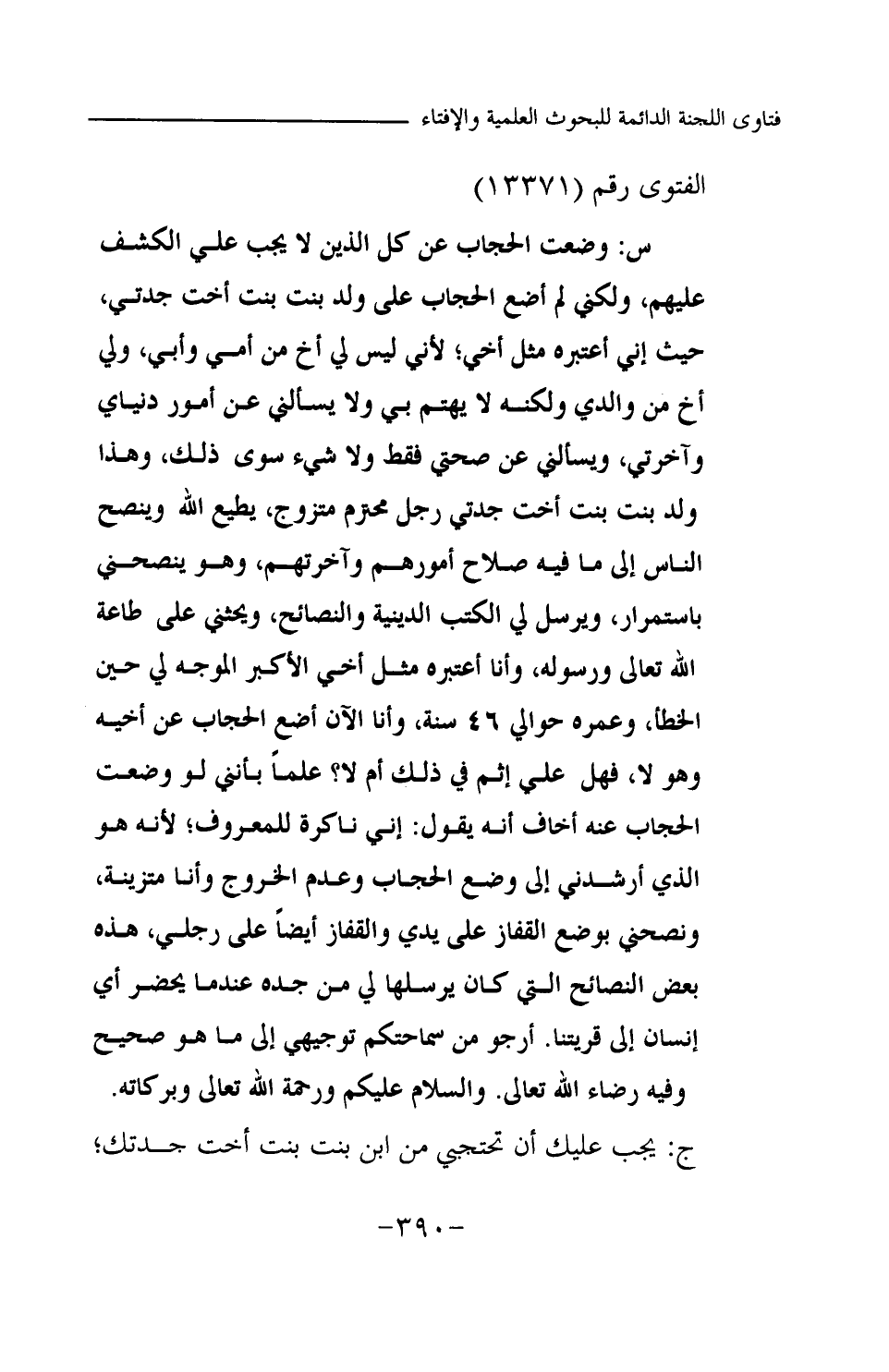 س: وضعت الحجاب عن كل الذين لا يجب علي الكشف عليهم، ولكني لم أضع الحجاب على ولد بنت بنت أخت جدتي، حيث إني أعتبره مثل أخي؛ لأني ليس لي أخ من أمي وأبي، ولي أخ من والدي ولكنه لا يهتم بي ولا يسألني عن أمور دنياي وآخرتي، ويسألني عن صحتي فقط ولا شيء سوى ذلك، وهذا ولد بنت بنت أخت جدتي رجل محترم متزوج، يطيع الله وينصح الناس إلى ما فيه صلاح أمورهم وآخرتهم، وهو ينصحني باستمرار، ويرسل لي الكتب الدينية والنصائح، ويحثني على طاعة الله تعالى ورسوله، وأنا أعتبره مثل أخي الأكبر الموجه لي حين الخطأ، وعمره حوالي 46 سنة، وأنا الآن أضع الحجاب عن أخيه وهو لا، فهل علي إثم في ذلك أم لا؟ علما بأنني لو وضعت الحجاب عنه أخاف أنه يقول: إني ناكرة للمعروف؛ لأنه هو الذي أرشدني إلى وضع الحجاب وعدم الخروج وأنا متزينة، ونصحني بوضع القفاز على يدي والقفاز أيضا على رجلي، هذه بعض النصائح التي كان يرسلها لي من جدة عندما يحضر أي إنسان إلى قريتنا، أرجو من سماحتكم توجيهي إلى ما هو صحيح وفيه رضا الله تعالى. والسلام عليكم ورحمة الله تعالى وبركاته.