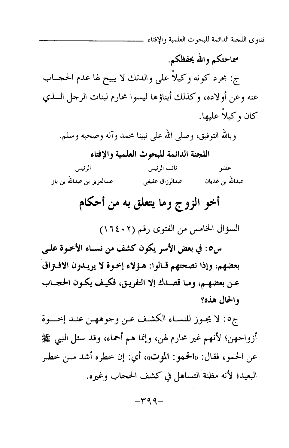 ج5: لا يجوز للنساء الكشف عن وجوههن عند إخوة أزواجهن؛ لأنهم غير محارم لهن، وإنما هم أحماء، وقد «سئل النبي-صلى الله عليه وسلم- عن الحمو، فقال: الحمو: الموت (¬1) » أي: إن خطره أشد من خطر البعيد؛ لأنه مظنة التساهل في كشف الحجاب وغيره.