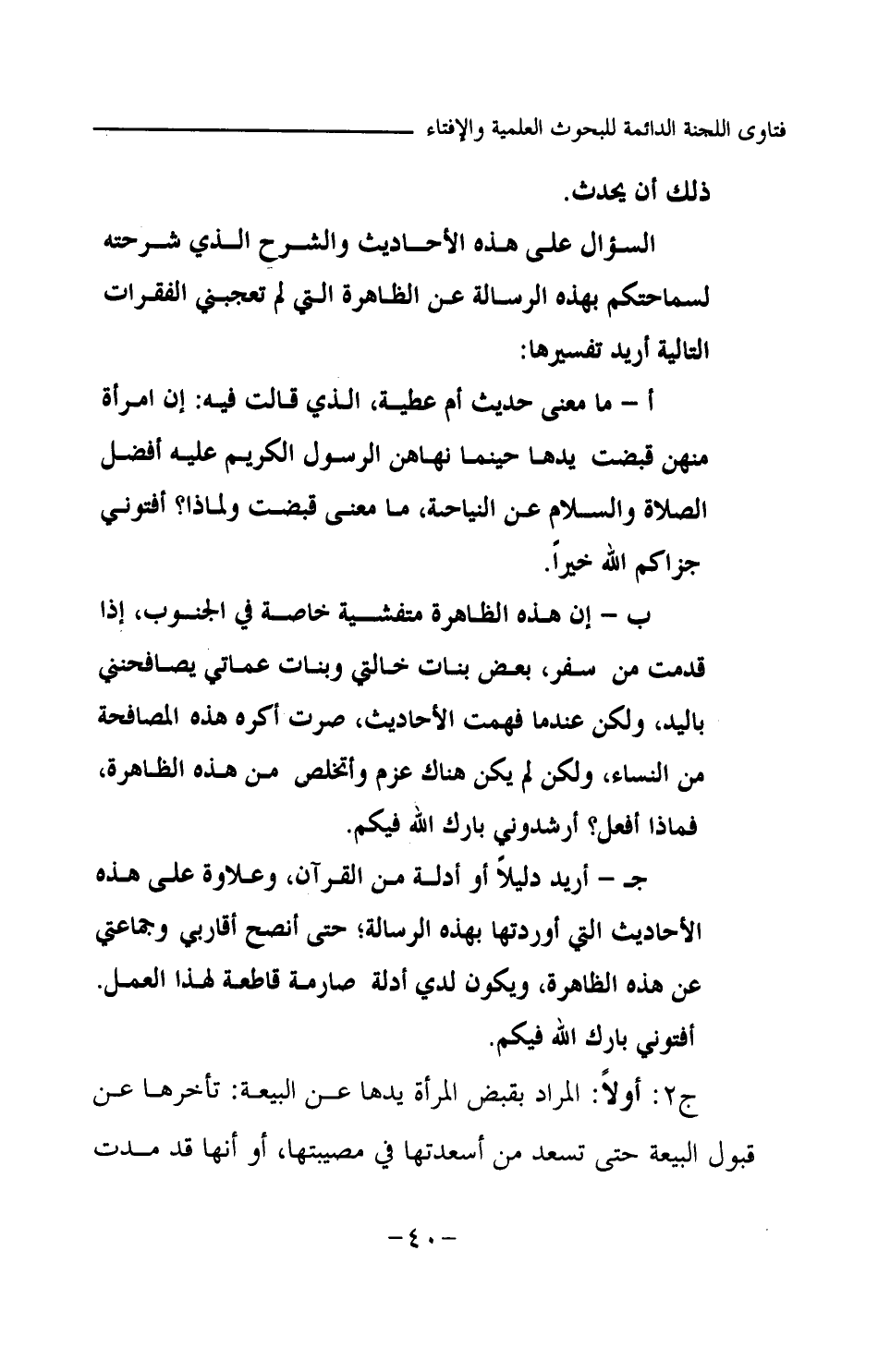 ذلك أن يحدث. السؤال على هذه الأحاديث والشرح الذي شرحته لسماحتكم بهذه الرسالة عن الظاهرة التي لم تعجبني الفقرات التالية أريد تفسيرها: أ- ما معنى حديث أم عطية الذي قالت فيه: «إن امرأة منهن قبضت يدها حينما نهاهن الرسول الكريم عليه أفضل الصلاة والسلام عن النياحة (¬1) » ما معنى قبضت ولماذا؟ أفتوني جزاكم الله خيرا. ب- إن هذه الظاهرة متفشية خاصة في الجنوب، إذا قدمت من سفر، بعض بنات خالتي وبنات عماتي يصافحنني باليد، ولكن عندما فهمت الأحاديث، صرت أكره هذه المصافحة من النساء، ولكن لم يكن هناك عزم وأتخلص من هذه الظاهرة، فماذا أفعل؟ أرشدوني بارك الله فيكم. ج- أريد دليلا أو أدلة من القرآن، وعلاوة على هذه الأحاديث التي أوردتها بهذه الرسالة؛ حتى أنصح أقاربي وجماعتي عن هذه الظاهرة، ويكون لدي أدلة صارمة قاطعة لهذا العمل. أفتوني بارك الله فيكم.