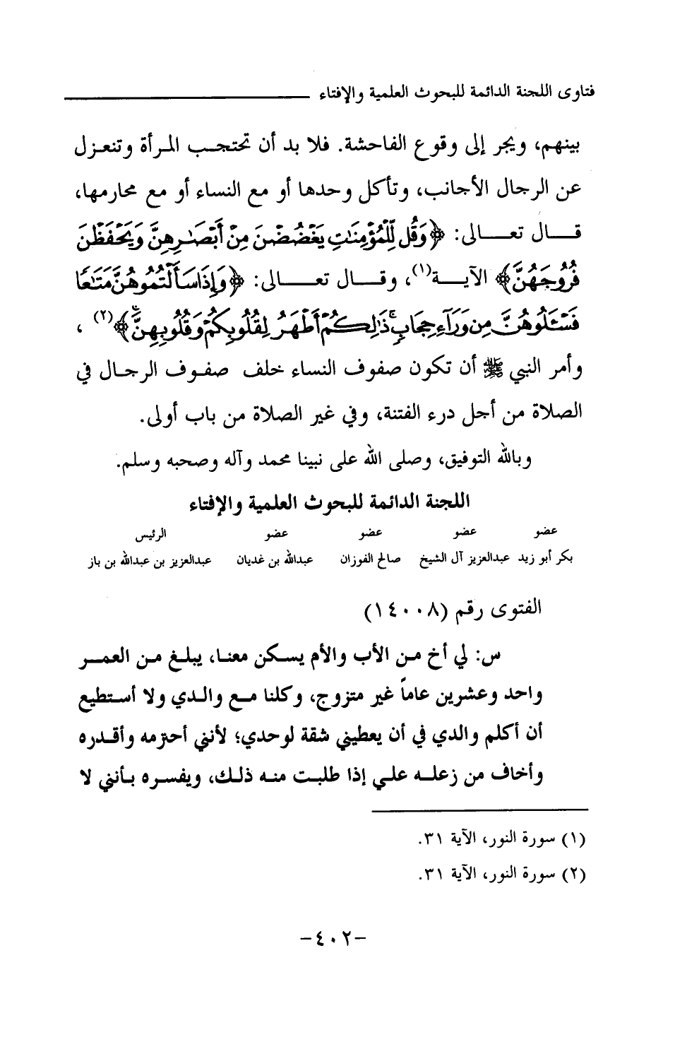 بينهم، ويجر إلى وقوع الفاحشة. فلا بد أن تحتجب المرأة وتنعزل عن الرجال الأجانب، وتأكل وحدها أو مع النساء أو مع محارمها، قال تعالى: {وَقُلْ لِلْمُؤْمِنَاتِ يَغْضُضْنَ مِنْ أَبْصَارِهِنَّ وَيَحْفَظْنَ فُرُوجَهُنَّ} (¬1) الآية، وقال تعالى: {وَإِذَا سَأَلْتُمُوهُنَّ مَتَاعًا فَاسْأَلُوهُنَّ مِنْ وَرَاءِ حِجَابٍ ذَلِكُمْ أَطْهَرُ لِقُلُوبِكُمْ وَقُلُوبِهِنَّ} (¬2) وأمر النبي -صلى الله عليه وسلم- أن تكون صفوف النساء خلف صفوف الرجال في الصلاة من أجل درء الفتنة، وفي غير الصلاة من باب أولى. وبالله التوفيق، وصلى الله على نبينا محمد وآله وصحبه وسلم.