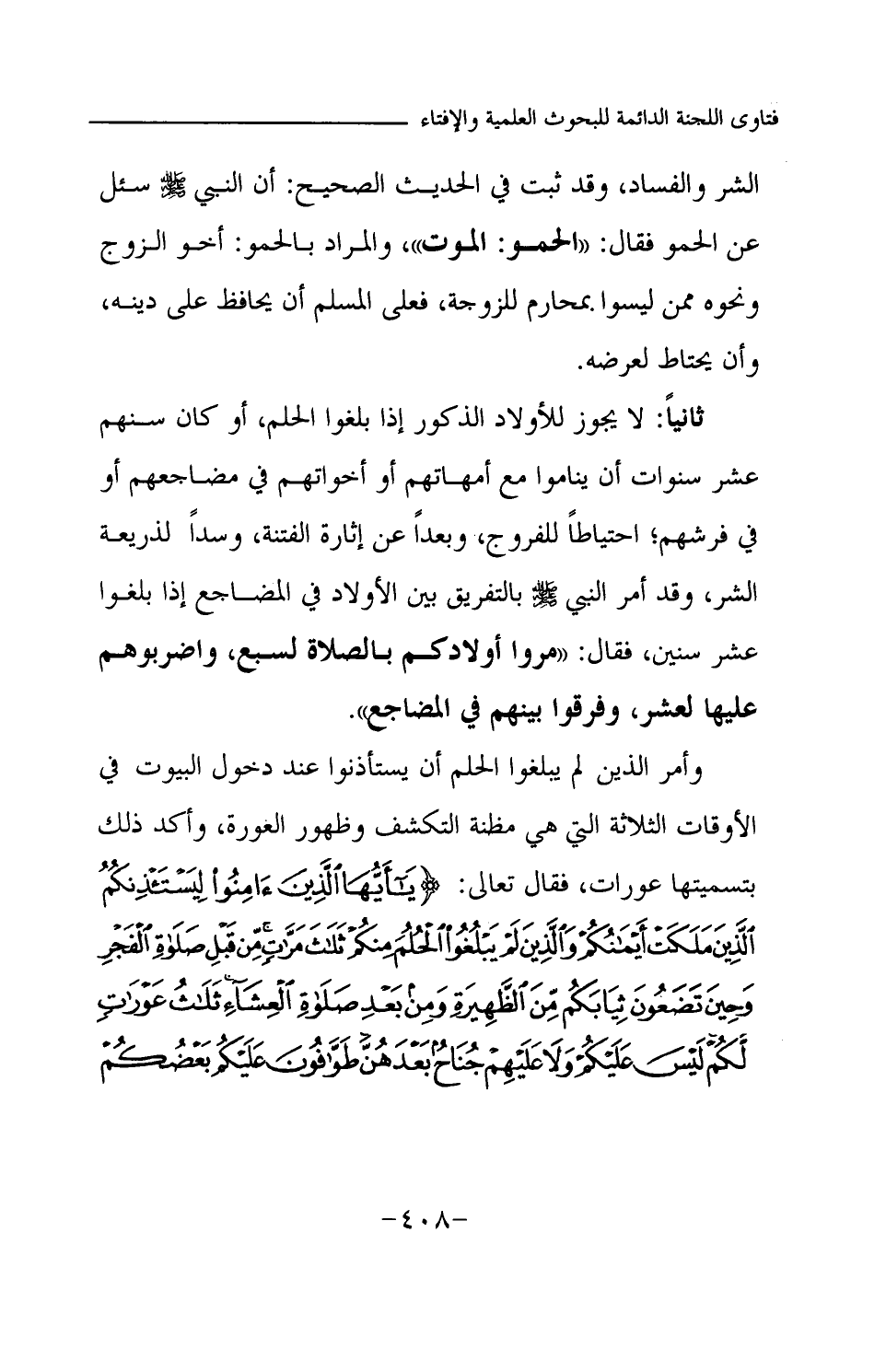 ثانيا: لا يجوز للأولاد الذكور إذا بلغوا الحلم، أو كان سنهم عشر سنوات أن يناموا مع أمهاتهم أو أخواتهم في مضاجعهم أو في فرشهم، احتياطا للفروج، وبعدا عن إثارة الفتنة، وسدا لذريعة الشر، وقد أمر النبي -صلى الله عليه وسلم- بالتفريق بين الأولاد في المضاجع إذا بلغوا عشر سنين، فقال: «مروا أولادكم بالصلاة لسبع، واضربوهم عليها لعشر، وفرقوا بينهم في المضاجع (¬2) » وأمر الذين لم يبلغوا الحلم أن يستأذنوا عند دخول البيوت في الأوقات الثلاثة التي هي مظنة التكشف وظهور العورة، وأكد ذلك بتسميتها عورات، فقال تعالى: {يَا أَيُّهَا الَّذِينَ آمَنُوا لِيَسْتَأْذِنْكُمُ الَّذِينَ مَلَكَتْ أَيْمَانُكُمْ وَالَّذِينَ لَمْ يَبْلُغُوا الْحُلُمَ مِنْكُمْ ثَلَاثَ مَرَّاتٍ مِنْ قَبْلِ صَلَاةِ الْفَجْرِ وَحِينَ تَضَعُونَ ثِيَابَكُمْ مِنَ الظَّهِيرَةِ وَمِنْ بَعْدِ صَلَاةِ الْعِشَاءِ ثَلَاثُ عَوْرَاتٍ لَكُمْ لَيْسَ عَلَيْكُمْ وَلَا عَلَيْهِمْ جُنَاحٌ بَعْدَهُنَّ طَوَّافُونَ عَلَيْكُمْ بَعْضُكُمْ عَلَى بَعْضٍ كَذَلِكَ يُبَيِّنُ اللَّهُ لَكُمُ الْآيَاتِ وَاللَّهُ عَلِيمٌ حَكِيمٌ} (¬3)