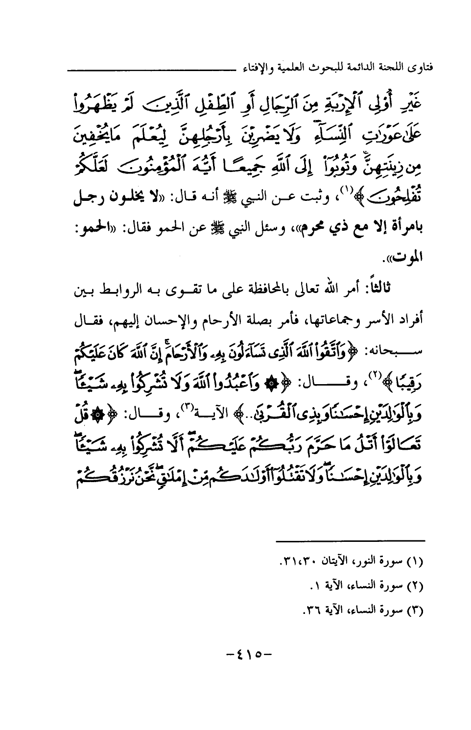 ثالثا: أمر الله تعالى بالمحافظة على ما تقوى به الروابط بين أفراد الأسر وجماعاتها، فأمر بصلة الأرحام والإحسان إليهم، فقال سبحانه: {وَاتَّقُوا اللَّهَ الَّذِي تَسَاءَلُونَ بِهِ وَالْأَرْحَامَ إِنَّ اللَّهَ كَانَ عَلَيْكُمْ رَقِيبًا} (¬3) وقال: {وَاعْبُدُوا اللَّهَ وَلَا تُشْرِكُوا بِهِ شَيْئًا وَبِالْوَالِدَيْنِ إِحْسَانًا وَبِذِي الْقُرْبَى} (¬4) الآية، وقال: {قُلْ تَعَالَوْا أَتْلُ مَا حَرَّمَ رَبُّكُمْ عَلَيْكُمْ أَلَّا تُشْرِكُوا بِهِ شَيْئًا وَبِالْوَالِدَيْنِ إِحْسَانًا وَلَا تَقْتُلُوا أَوْلَادَكُمْ مِنْ إِمْلَاقٍ نَحْنُ نَرْزُقُكُمْ وَإِيَّاهُمْ} (¬5)