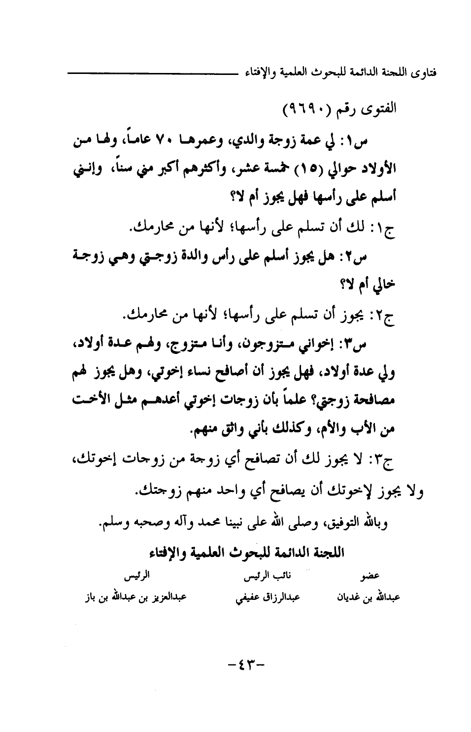 س1: لي عمة زوجة والدي، وعمرها 70 عاما، ولها من الأولاد حوالي (15) خمسة عشر، وأكثرهم أكبر مني سنا، وإنني أسلم على رأسها فهل يجوز أم لا؟