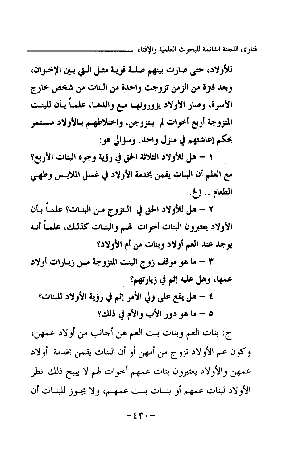للأولاد، حتى صارت بينهم صلة قوية مثل التي بين الإخوان، وبعد فترة من الزمن تزوجت واحدة من البنات من شخص خارج الأسرة، وصار الأولاد يزورونها مع والدها، علما بأن للبنت المتزوجة أربع أخوات لم يتزوجن، واختلاطهم بالأولاد مستمر بحكم إعاشتهم في منزل واحد وسؤالي هو