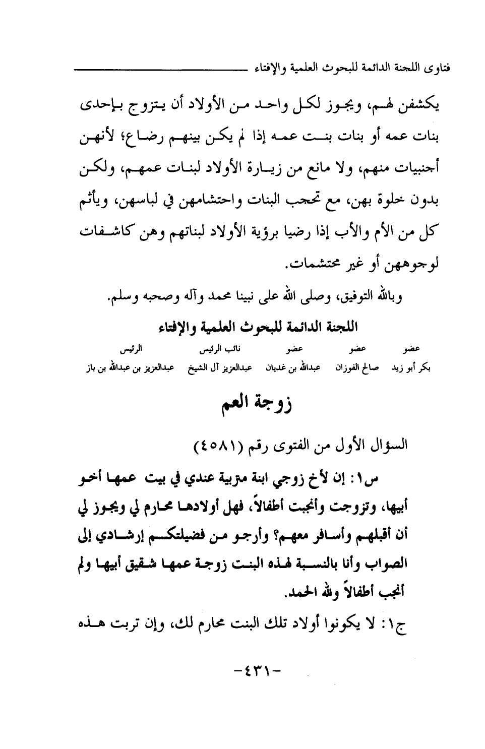 يكشفن لهم، ويجوز لكل واحد من الأولاد أن يتزوج بإحدى بنات عمه أو بنات بنت عمه إذا لم يكن بينهم رضاع، لأنهن أجنبيات منهم، ولا مانع من زيارة الأولاد لبنات عمهم، ولكن بدون خلوة بهن، مع تحجب البنات واحتشامهن في لباسهن، ويأثم كل من الأم والأب إذا رضيا برؤية الأولاد لبناتهم وهن كاشفات لوجوههن أو غير محتشمات وبالله التوفيق، وصلى الله على نبينا محمد وآله وصحبه وسلم