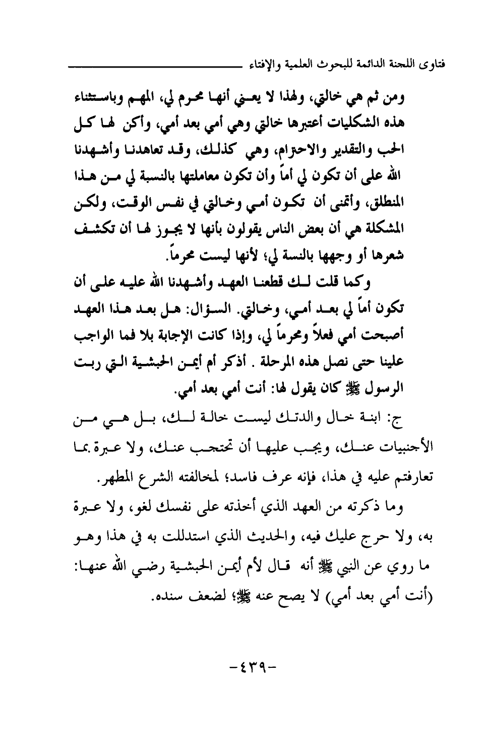 ومن ثم هي خالتي، ولهذا لا يعني أنها محرم لي، المهم وباستثناء هذه الشكليات أعتبرها خالتي وهي أمي بعد أمي، وأكن لها كل الحب والتقدير والاحترام، وهي كذلك، وقد تعاهدنا وأشهدنا الله على أن تكون لي أما وأن تكون معاملتها بالنسبة لي من هذا المنطلق، وأتمنى أن تكون أمي وخالتي في نفس الوقت، ولكن المشكلة هي أن بعض الناس يقولون بأنها لا يجوز لها أن تكشف شعرها أو وجهها بالنسبة لي؛ لأنها ليست محرما وكما قلت لك قطعنا العهد وأشهدنا الله عليه على أن تكون أما لي بعد أمي، وخالتي السؤال هل بعد هذا العهد أصبحت أمي فعلا ومحرما لي، وإذا كانت الإجابة بلا فما الواجب علينا حتى نصل هذه المرحلة أذكر أم أيمن الحبشية التي ربت الرسول -صلى الله عليه وسلم- يقول لها أنت أمي بعد أمي