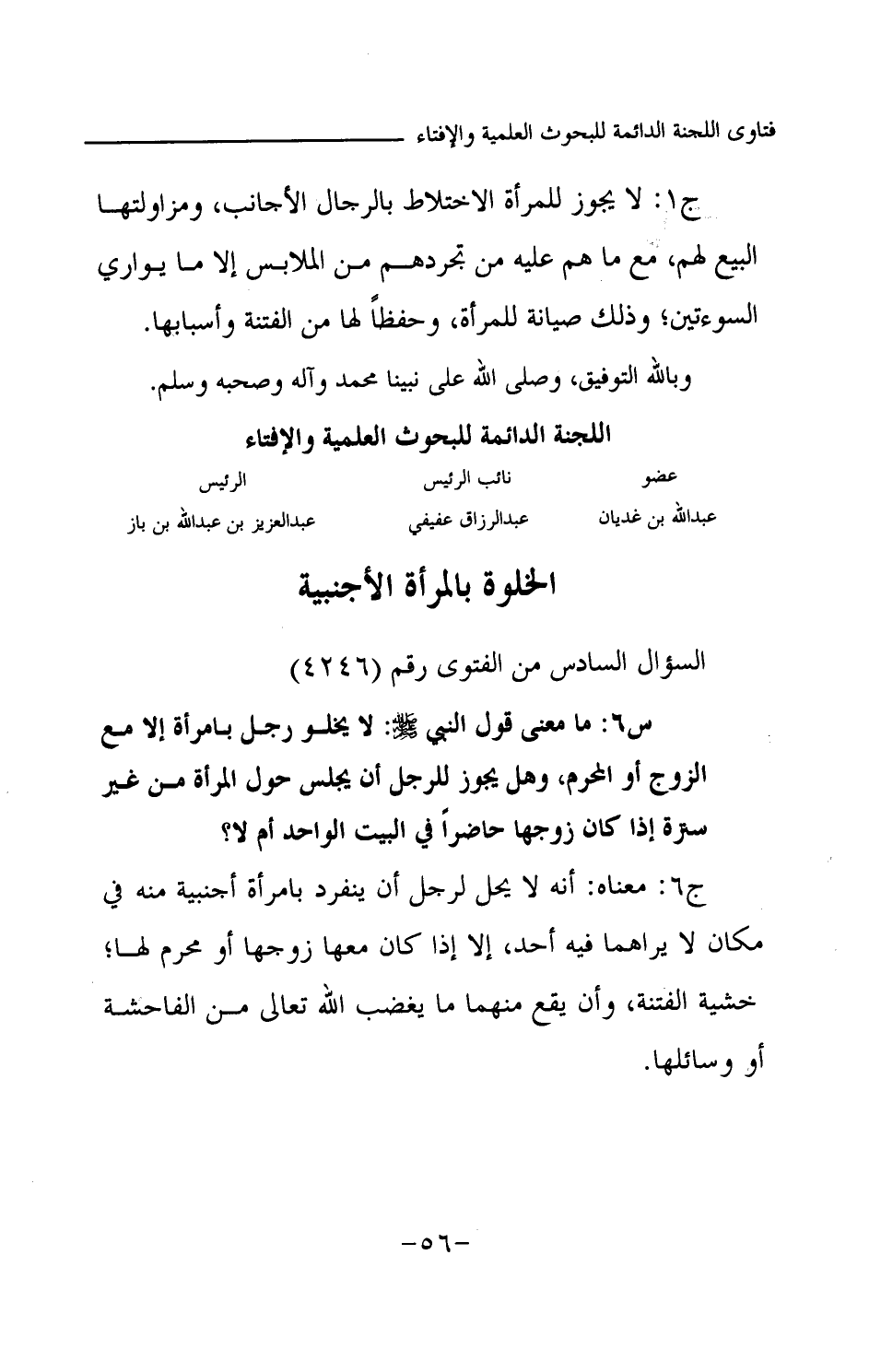 س6: ما معنى قول النبي -صلى الله عليه وسلم-: (لا يخلو رجل بامرأة إلا مع الزوج أو المحرم) ؟ وهل يجوز للرجل أن يجلس حول المرأة من غير سترة إذا كان زوجها حاضرا في البيت الواحد أم لا؟