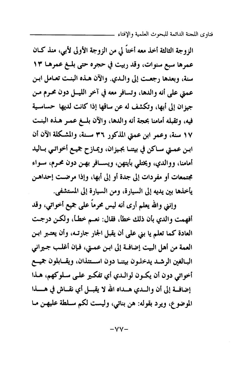 الزوجة الثالثة أخذ معه أختا لي من الزوجة الأولى لأبي، منذ كان عمرها سبع سنوات، وقد ربيت في حجره حتى بلغ عمرها 13 سنة، وبعدها رجعت إلى والدي. والآن هذه البنت تعامل ابن عمتي على أنه والدها، وتسافر معه في آخر الليل دون محرم من جيزان إلى أبها وتكشف له عن ساقها إذا كانت لديها حساسية فيه، وتقبله أمامنا بحجة أنه والدها، والآن بلغ عمر هذه البنت 17 سنة، وعمر ابن عمتي المذكور 36 سنة، والمشكلة الآن أن ابن عمتي ساكن في بيتنا بجيزان ويمازح جميع أخواتي باليد أمامنا، ووالدي، ويختلي بأيتهن، ويسافر بهن دون محرم، سواء مجتمعات أو مفردات إلى جدة أو إلى أبها وإذا مرضت إحداهن يأخذها بين يديه إلى السيارة، ومن السيارة إلى المستشفى.