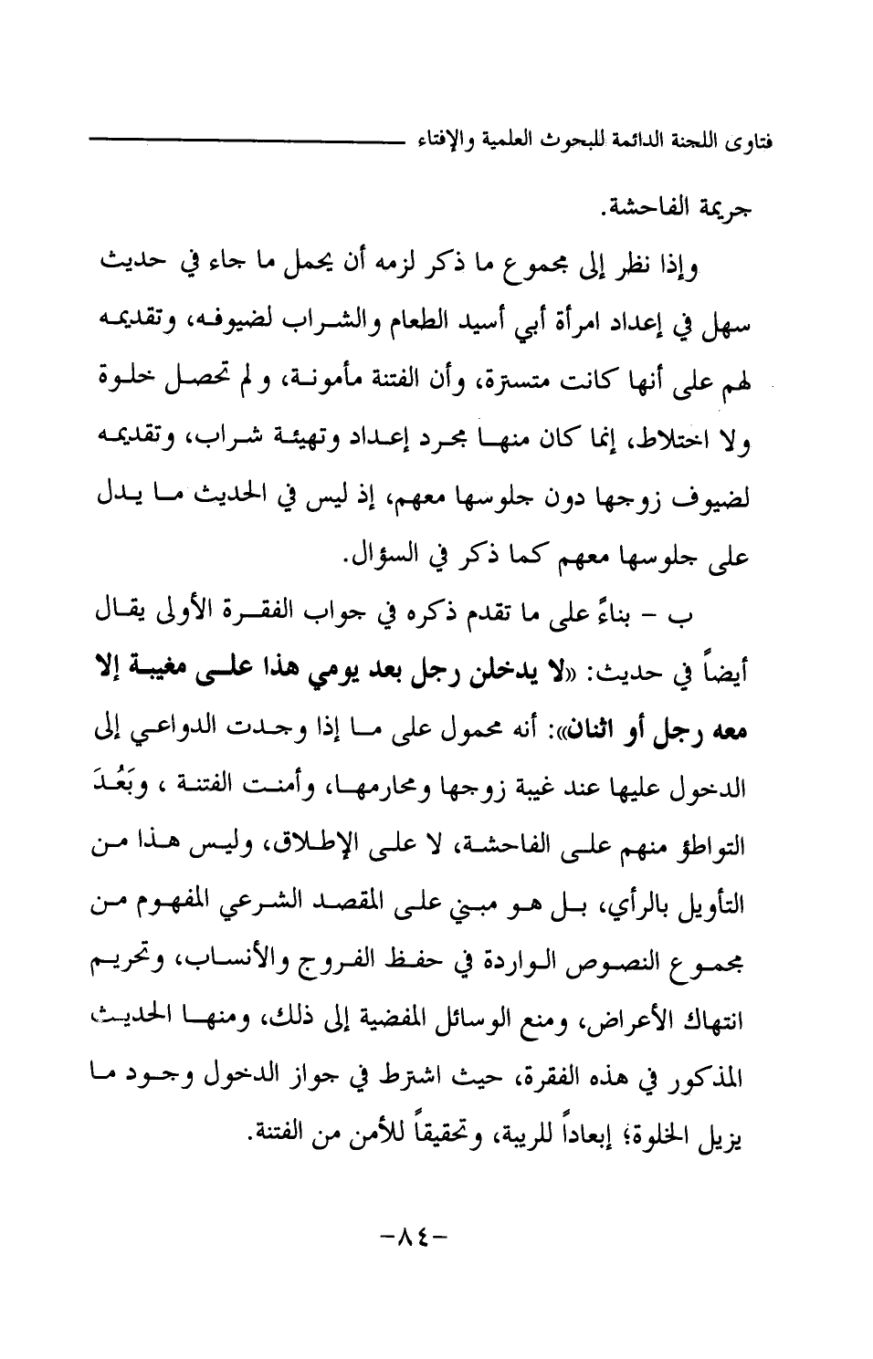 جريمة الفاحشة. وإذا نظر إلى مجموع ما ذكر لزمه أن يحمل ما جاء في حديث سهل في إعداد امرأة أبي أسيد الطعام والشراب لضيوفه، وتقديمه لهم على أنها كانت متسترة، وأن الفتنة مأمونة، ولم تحصل خلوة ولا اختلاط، إنما كان منها مجرد إعداد وتهيئة شراب، وتقديمه لضيوف زوجها دون جلوسها معهم، إذ ليس في الحديث ما يدل على جلوسها معهم كما ذكر في السؤال. ب- بناء على ما تقدم ذكره في جواب الفقرة الأولى يقال أيضا في حديث: «لا يدخلن رجل بعد يومي هذا على مغيبة إلا معه رجل أو اثنان (¬1) » أنه محمول على ما إذا وجدت الدواعي إلى الدخول عليها عند غيبة زوجها ومحارمها، وأمنت الفتنة، وبعد التواطؤ منهم على الفاحشة، لا على الإطلاق، وليس هذا من التأويل بالرأي، بل هو مبني على المقصد الشرعي المفهوم من مجموع النصوص الواردة في حفظ الفروج والأنساب، وتحريم انتهاك الأعراض، ومنع الوسائل المفضية إلى ذلك، ومنها الحديث المذكور في هذه الفقرة، حيث اشترط في جواز الدخول وجود ما يزيل الخلوة؛ إبعادا للريبة، وتحقيقا للأمن من الفتنة.