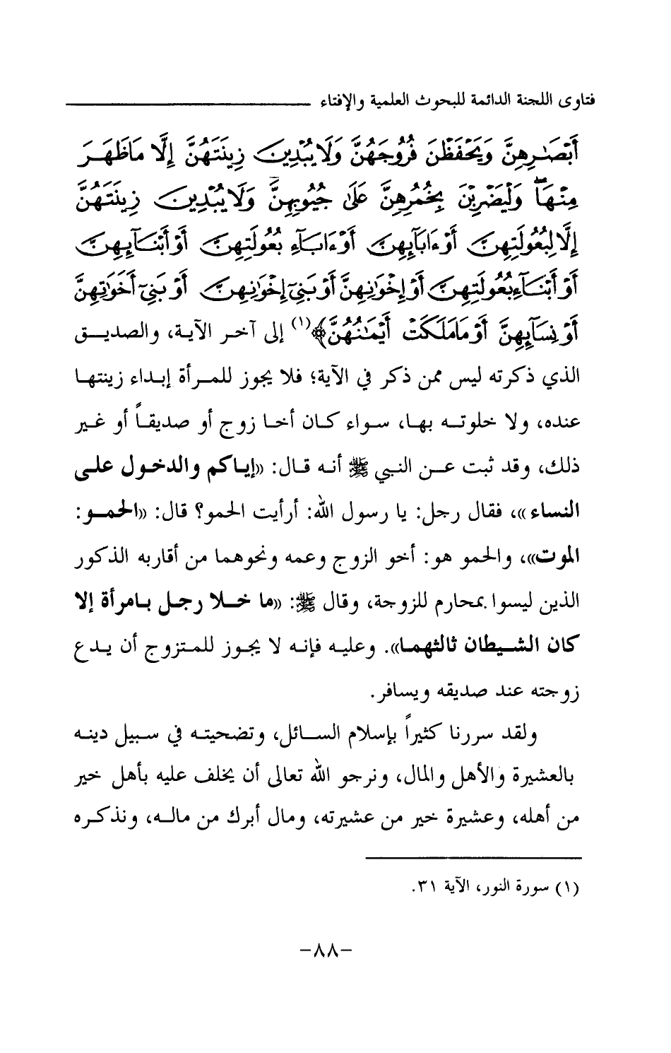 إلى آخر الآية، والصديق الذي ذكرته ليس ممن ذكر في الآية؛ فلا يجوز للمرأة إبداء زينتها عنده، ولا خلوته بها، سواء كان أخا زوج أو صديقا أو غير ذلك، وقد ثبت عن النبي -صلى الله عليه وسلم- أنه قال: «إياكم والدخول على النساء. فقال رجل: يا رسول الله، أرأيت الحمو؟ قال: الحمو الموت (¬1) » والحمو هو أخو الزوج وعمه ونحوهما من أقاربه الذكور الذين ليسوا بمحارم للزوجة، وقال: «ما خلا رجل بامرأة إلا كان الشيطان ثالثهما (¬2) » وعليه فإنه لا يجوز للمتزوج أن يدع زوجته عند صديقه ويسافر. ولقد سررنا كثيرا بإسلام السائل، وتضحيته في سبيل دينه بالعشيرة والأهل والمال، ونرجو الله تعالى أن يخلف عليه بأهل خير من أهله، وعشيرة خير من عشيرته، ومال أبرك من ماله، ونذكره
