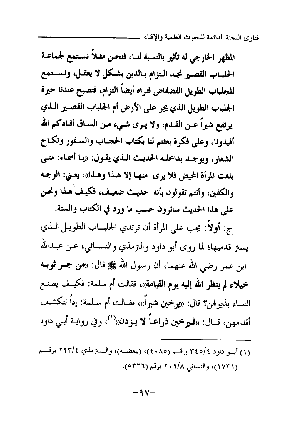 ج: أولا: يجب على المرأة أن ترتدي الجلباب الطويل الذي يستر قدميها؛ لما روى أبو داود والترمذي والنسائي عن عبد الله بن عمر رضي الله عنهما، أن رسول الله -صلى الله عليه وسلم-قال: «من جر ثوبه خيلاء لم ينظر الله إليه يوم القيامة. فقالت أم سلمة فكيف يصنع النساء بذيولهن؟ قال: يرخين شبرا. فقالت أم سلمة إذا تنكشف أقدامهن. قال: فيرخين ذراعا لا يزدن (¬2) » وفي رواية أبي داود