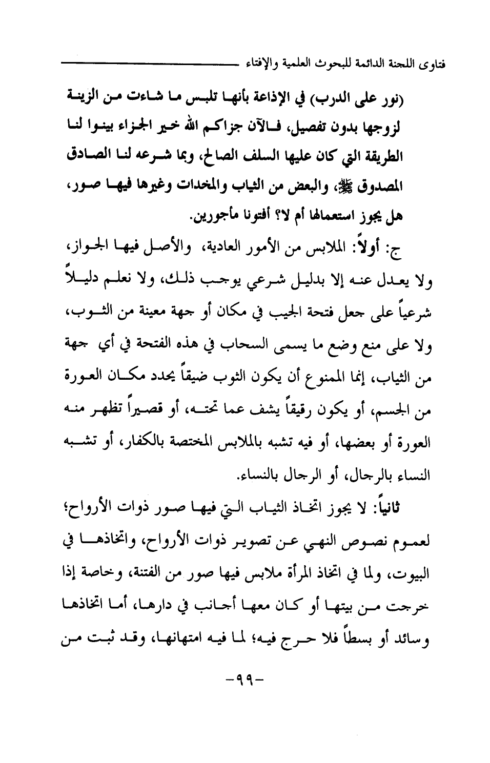 (نور على الدرب) في الإذاعة بأنها تلبس ما شاءت من الزينة لزوجها بدون تفصيل، فالآن -جزاكم الله خير الجزاء- بينوا لنا الطريقة التي كان عليها السلف الصالح، وبما شرعه لنا الصادق المصدوق، والبعض من الثياب والمخدات وغيرها فيها صور، هل يجوز استعمالها أم لا؟ أفتونا مأجورين.