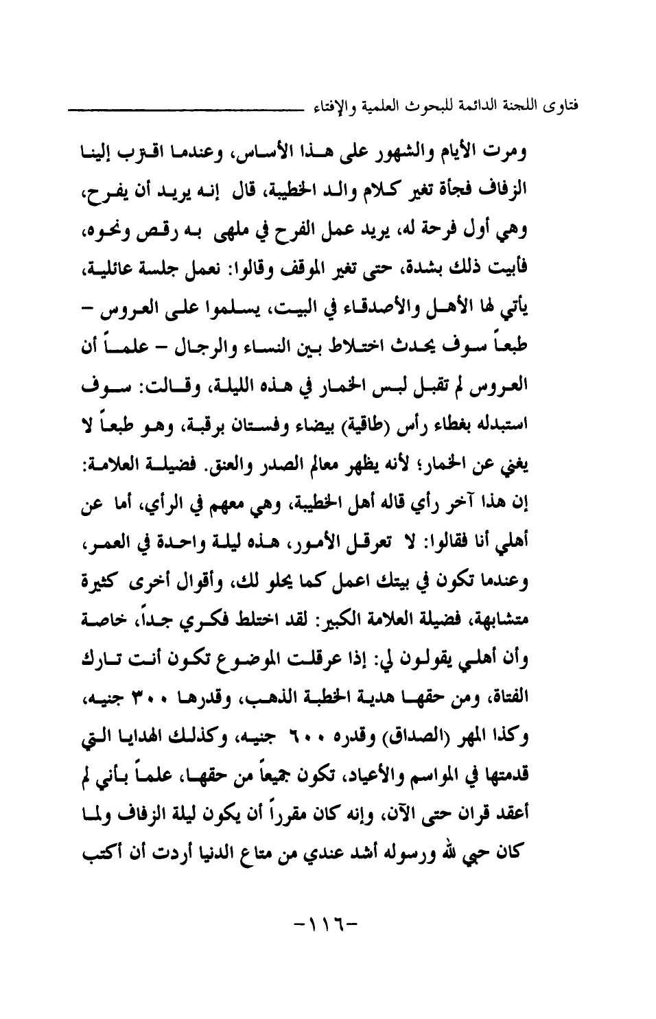فضيلة العلامة: إن هذا آخر رأي قاله أهل الخطيبة، وهي معهم في الرأي، أما عن أهلي أنا فقالوا: لا تعرقل الأمور، هذه ليلة واحدة في العمر، وعندما تكون في بيتك اعمل كما يحلو لك، وأقوال أخرى محيرة متشابهة، فضيلة العلامة الكبير: لقد اختلط فكري جدا، خاصة وأن أهلي يقولون لي: إذا عرقلت الموضوع تكون أنت تارك الفتاة، ومن حقها هدية الخطبة الذهب، وقدرها 300 جنيه، وكذا المهر (الصداق) وقدره 600 جنيه، وكذلك الهدايا التي قدمتها في المواسم والأعياد، تكون جميعا من حقها، علما بأني لم أعقد قران حتى الآن، وإنه كان مقررا أن يكون ليلة الزفاف ولما كان حبي لله ورسوله أشد عندي من متاع الدنيا أردت أن أكتب