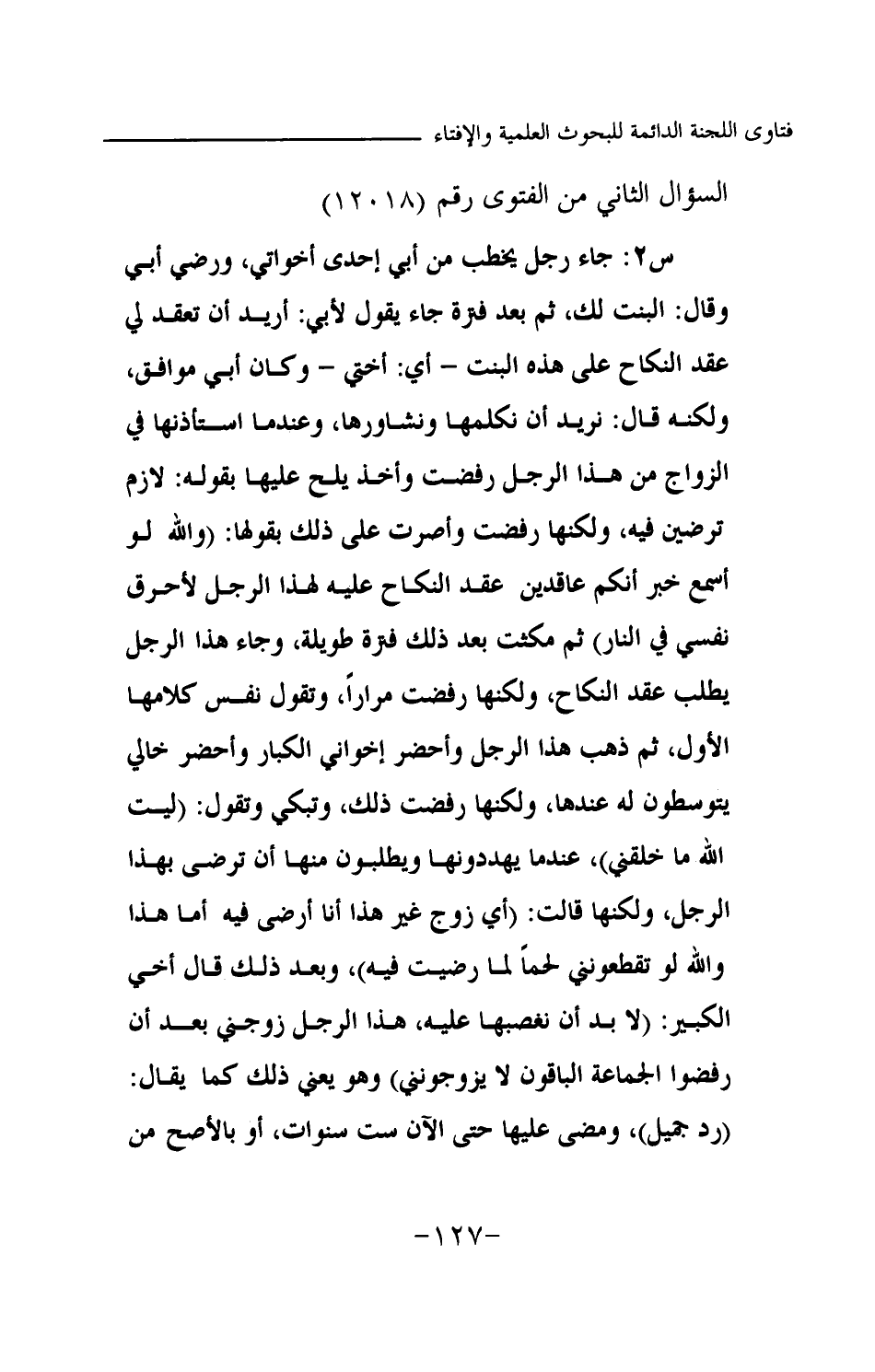 س2: جاء رجل يخطب من أبي إحدى أخواتي، ورضي أبي وقال: البنت لك، ثم بعد فترة جاء يقول لأبي: أريد أن تعقد لي عقد النكاح على هذه البنت- أي: أختي- وكان أبي موافق، ولكنه قال: نريد أن نكلمها ونشاورها، وعندما استأذنها في الزواج من هذا الرجل رفضت وأخذ يلح عليها بقوله: لازم ترضين فيه، ولكنها رفضت وأصرت على ذلك بقولها: (والله لو أسمع خبر أنكم عاقدون عقد النكاح عليه لهذا الرجل لأحرق نفسي في النار) ثم مكثت بعد ذلك فترة طويلة، وجاء هذا الرجل يطلب عقد النكاح، ولكنها رفضت مرارا، وتقول نفس كلامها الأول، ثم ذهب هذا الرجل وأحضر إخواني الكبار وأحضر خالي يتوسطون له عندها، ولكنها رفضت ذلك، وتبكي وتقول: (ليت الله ما خلقني) ، عندما يهددونها ويطلبون منها أن ترضى بهذا الرجل، ولكنها قالت: (أي زوج غير هذا أنا أرضى فيه أما هذا والله لو تقطعونني لحما لما رضيت فيه) ، وبعد ذلك قال أخي الكبير: (لا بد أن نغصبها عليه، هذا الرجل زوجني بعد أن رفضوا الجماعة الباقون لا يزوجونني) وهو يعني ذلك كما يقال: (رد جميل) ، ومضى عليها حتى الآن ست سنوات، أو بالأصح من