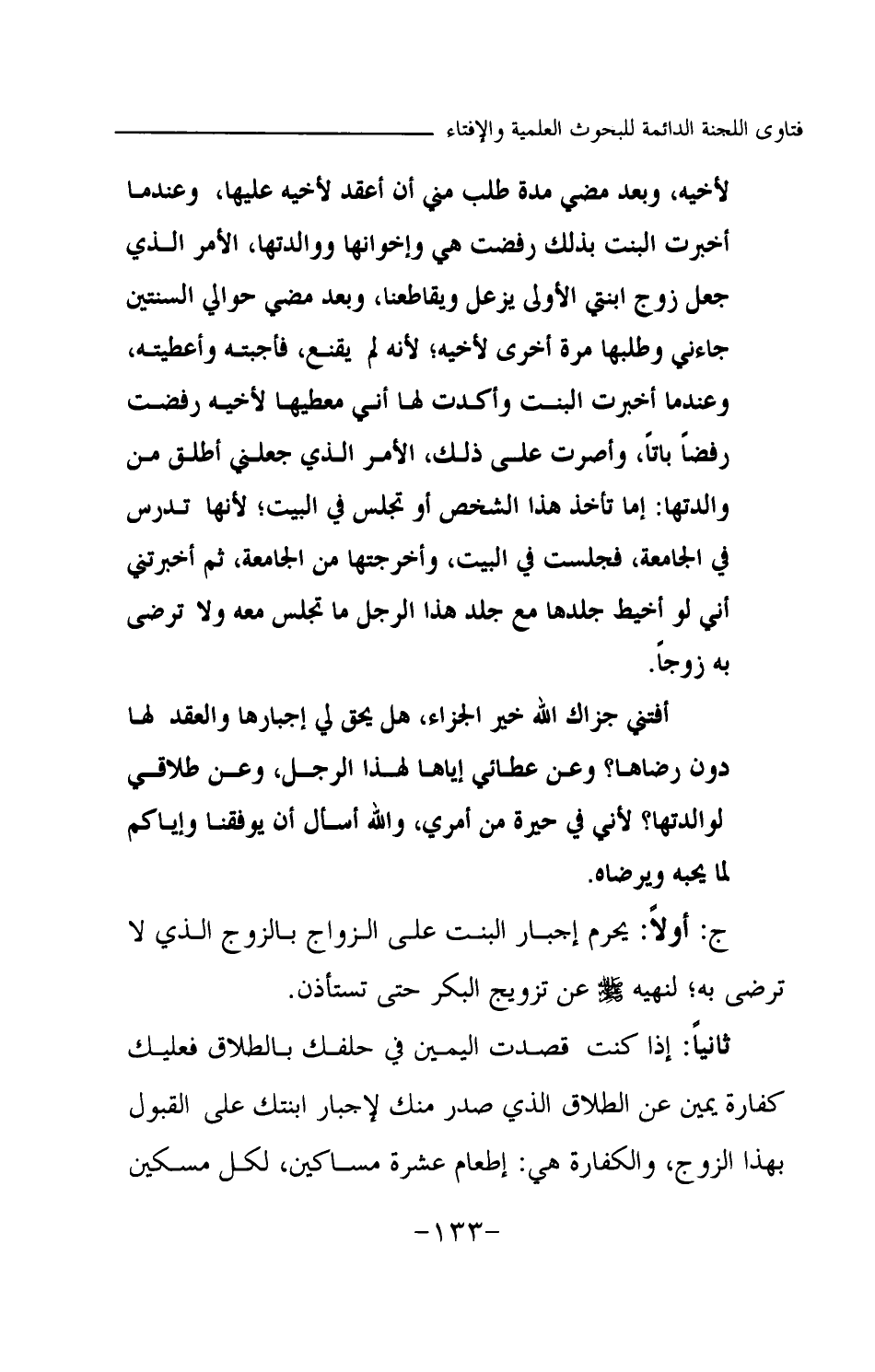 لأخيه، وبعد مضي مدة طلب مني أن أعقد لأخيه عليها، وعندما أخبرت البنت بذلك رفضت هي وإخوانها ووالدتها، الأمر الذي جعل زوج ابنتي الأولى يزعل ويقاطعنا، وبعد مضي حوالي السنتين جاءني وطلبها مرة أخرى لأخيه؛ لأنه لم يقنع، فأجبته وأعطيته، وعندما أخبرت البنت وأكدت لها أني معطيها لأخيه رفضت رفضا باتا، وأصرت على ذلك، الأمر الذي جعلني أطلق من والدتها: إما تأخذ هذا الشخص أو تجلس في البيت؛ لأنها تدرس في الجامعة، فجلست في البيت، وأخرجتها من الجامعة، ثم أخبرتني أني لو أخيط جلدها مع جلد هذا الرجل ما تجلس معه ولا ترضى به زوجا.