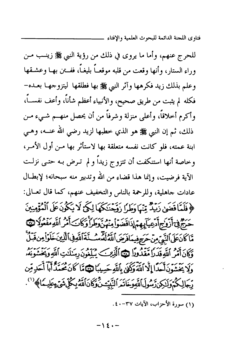 للحرج عنهم، وأما ما يروى في ذلك من رؤية النبي -صلى الله عليه وسلم- زينب من وراء الستار، وأنها وقعت من قلبه موقعا بليغا، ففتن بها وعشقها وعلم بذلك زيد فكرهها وآثر النبي -صلى الله عليه وسلم- بها فطلقها ليتزوجها بعده- فكله لم يثبت من طريق صحيح، والأنبياء أعظم شأنا، وأعف نفسا، وأكرم أخلاقا، وأعلى منزلة وشرفا من أن يحصل منهم شيء من ذلك، ثم إن النبي -صلى الله عليه وسلم- هو الذي خطبها لزيد -رضي الله عنه-، وهي ابنة عمته، فلو كانت نفسه متعلقة بها لاستأثر بها من أول الأمر، وخاصة أنها استنكفت أن تتزوج زيدا ولم ترض به حتى نزلت الآية فرضيت، وإنما هذا قضاء من الله وتدبير منه سبحانه؛ لإبطال عادات جاهلية، وللرحمة بالناس والتخفيف عنهم، كما قال تعالى: {فَلَمَّا قَضَى زَيْدٌ مِنْهَا وَطَرًا زَوَّجْنَاكَهَا لِكَيْ لَا يَكُونَ عَلَى الْمُؤْمِنِينَ حَرَجٌ فِي أَزْوَاجِ أَدْعِيَائِهِمْ إِذَا قَضَوْا مِنْهُنَّ وَطَرًا وَكَانَ أَمْرُ اللَّهِ مَفْعُولًا} (¬1) {مَا كَانَ عَلَى النَّبِيِّ مِنْ حَرَجٍ فِيمَا فَرَضَ اللَّهُ لَهُ سُنَّةَ اللَّهِ فِي الَّذِينَ خَلَوْا مِنْ قَبْلُ وَكَانَ أَمْرُ اللَّهِ قَدَرًا مَقْدُورًا} (¬2) {الَّذِينَ يُبَلِّغُونَ رِسَالَاتِ اللَّهِ وَيَخْشَوْنَهُ وَلَا يَخْشَوْنَ أَحَدًا إِلَّا اللَّهَ وَكَفَى بِاللَّهِ حَسِيبًا} (¬3) {مَا كَانَ مُحَمَّدٌ أَبَا أَحَدٍ مِنْ رِجَالِكُمْ وَلَكِنْ رَسُولَ اللَّهِ وَخَاتَمَ النَّبِيِّينَ وَكَانَ اللَّهُ بِكُلِّ شَيْءٍ عَلِيمًا} (¬4)