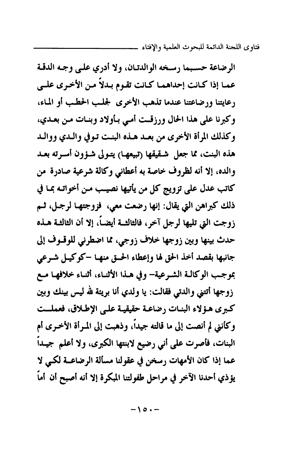 الرضاعة حسبما رسخه الوالدتان، ولا أدري على وجه الدقة عما إذا كانت إحداهما كانت تقوم بدلا من الأخرى على رعايتنا ورضاعتنا عندما تذهب الأخرى لجلب الحطب أو الماء، وكبرنا على هذا الحال ورزقت أمي بأولاد وبنات من بعدي، وكذلك المرأة الأخرى من بعد هذه البنت توفي والدي ووالد هذه البنت، مما جعل شقيقها (تبيعها) يتولى شئون أسرته بعد والده، إلا أنه لظروف خاصة به أعطاني وكالة شرعية صادرة من كاتب عدل على تزويج كل من يأتيها نصيب من أخواته بما في ذلك كبراهن التي يقال: إنها رضعت معي، فزوجتها لرجل، ثم زوجت التي تليها لرجل آخر، فالثالثة أيضا، إلا أن الثالثة هذه حدث بينها وبين زوجها خلاف زوجي، مما اضطرني للوقوف إلى جانبها بقصد أخذ الحق لها وإعطاء الحق منها -كوكيل شرعي بموجب الوكالة الشرعية- وفي هذا الأثناء، أثناء خلافها مع زوجهما أتتني والدتي فقالت: يا ولدي أنا بريئة لله ليس بينك وبين كبرى هؤلاء البنات رضاعة حقيقية على الإطلاق، فعملت وكأنني لم أنصت إلى ما قالته جيدا، وذهبت إلى المرأة الأخرى أم البنات، فأصرت على أني رضيع لابنتها الكبرى، ولا أعلم جيدا عما إذا كان الأمهات رسخن في عقولنا مسألة الرضاعة لكي لا يؤذي أحدنا الآخر في مراحل طفولتنا المبكرة إلا أنه أصبح أن أما