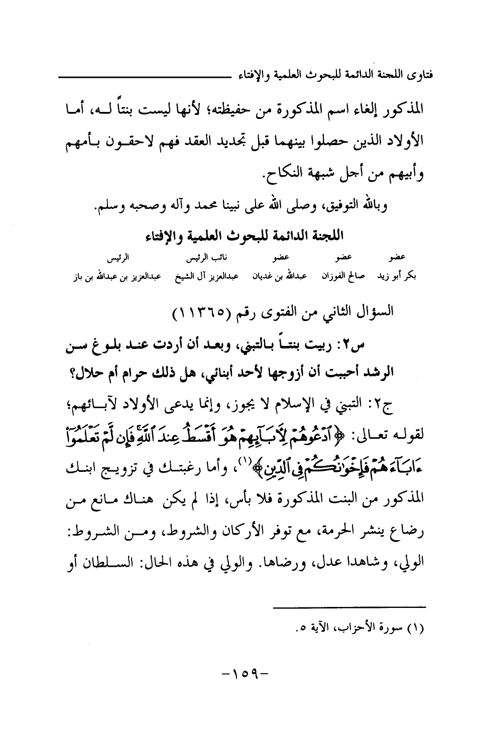 ج2: التبني في الإسلام لا يجوز، وإنما يدعى الأولاد لآبائهم، لقوله تعالى: {ادْعُوهُمْ لِآبَائِهِمْ هُوَ أَقْسَطُ عِنْدَ اللَّهِ فَإِنْ لَمْ تَعْلَمُوا آبَاءَهُمْ فَإِخْوَانُكُمْ فِي الدِّينِ} (¬1) وأما رغبتك في تزويج ابنك المذكور من البنت المذكورة فلا بأس، إذا لم يكن هناك مانع من رضاع ينشر الحرمة، مع توفر الأركان والشروط، ومن الشروط: الولي، وشاهدا عدل، ورضاها. والولي في هذه الحال: السلطان