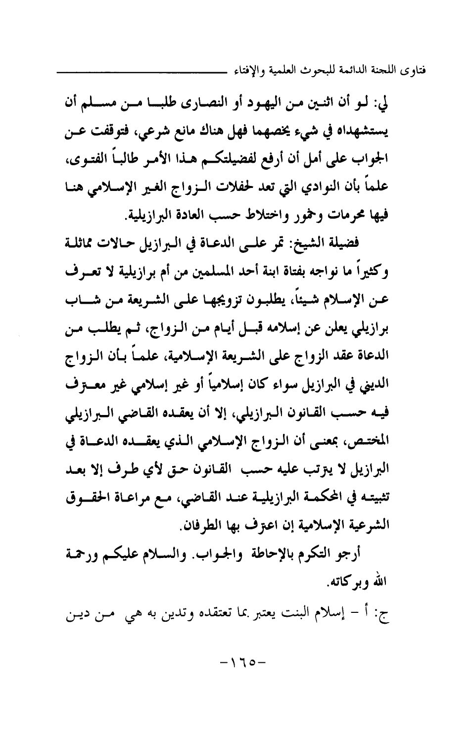 فضيلة الشيخ: تمر على الدعاة في البرازيل حالات مماثلة وكثيرا ما نواجه بفتاة ابنة أحد المسلمين من أم برازيلية لا تعرف عن الإسلام شيئا، يطلبون تزويجها على الشريعة من شابا برازيليا يعلن عن إسلامه قبل أيام من الزواج، ثم يطلب من الدعاة عقد الزواج على الشريعة الإسلامية، علما بأن الزواج الديني في البرازيل سواء كان إسلاميا أو غير إسلامي غير معترف فيه حسب القانون البرازيلي، إلا أن يعقده القاضي البرازيلي المختص، بمعنى أن الزواج الإسلامي الذي يعقده الدعاة في البرازيل لا يترتب عليه حسب القانون حق لأي طرف إلا بعد تثبيته في المحكمة البرازيلية عند القاضي، مع مراعاة الحقوق الشرعية الإسلامية إن اعترف بها الطرفان.