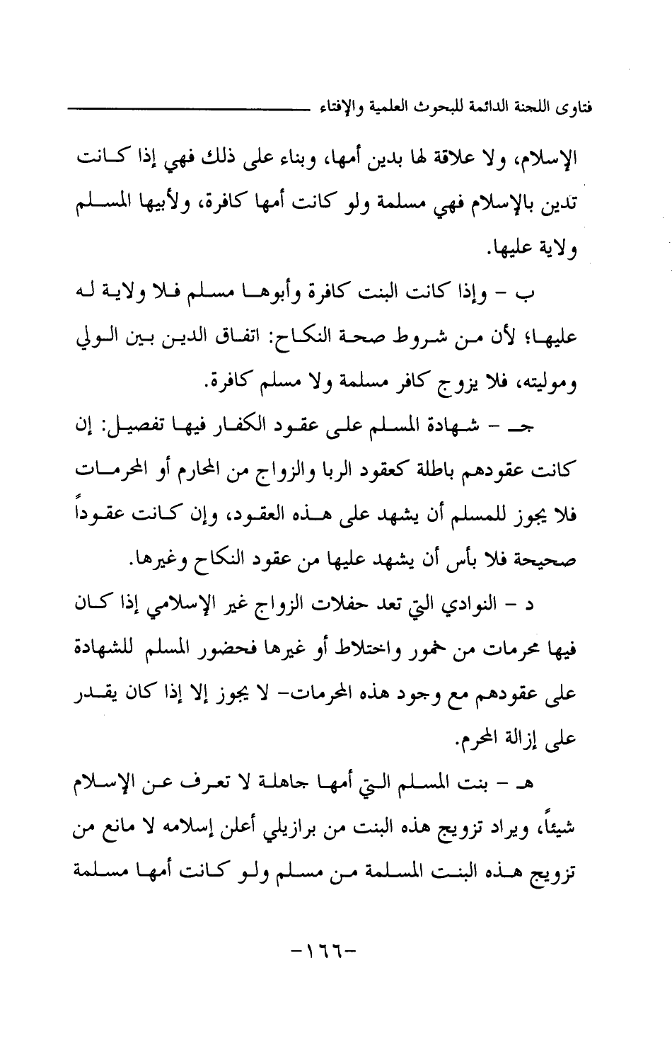 الإسلام، ولا علاقة لها بدين أمها، وبناء على ذلك فهي إذا كانت تدين بالإسلام فهي مسلمة ولو كانت أمها كافرة، ولأبيها المسلم ولاية عليها. ب- وإذا كانت البنت كافرة وأبوها مسلم فلا ولاية له عليها؛ لأن من شروط صحة النكاح: اتفاق الدين بين الولي وموليته، فلا يزوج كافر مسلمة ولا مسلم كافرة. ج- شهادة المسلم على عقود الكفار فيها تفصيل: إن كانت عقودهم باطلة كعقود الربا والزواج من المحارم أو المحرمات، فلا يجوز للمسلم أن يشهد على هذه العقود، وإن كانت عقودا صحيحة فلا بأس أن يشهد عليها من عقود النكاح وغيرها. د- النوادي التي تعد حفلات الزواج غير الإسلامي إذا كان فيها محرمات من خمور واختلاط أو غيرها، فحضور المسلم للشهادة على عقودهم مع وجود هذه المحرمات لا يجوز، إلا إذا كان يقدر على إزالة المحرم. هـ- بنت المسلم التي أمها جاهلة لا تعرف عن الإسلام شيئا، ويراد تزويج هذه البنت من برازيلي أعلن إسلامه - لا مانع من تزويج هذه البنت المسلمة من مسلم ولو كانت أمها مسلمة