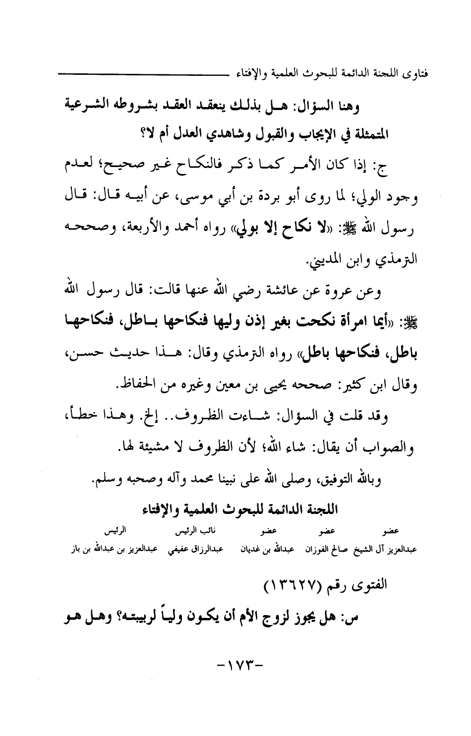 ج: إذا كان الأمر كما ذكر فالنكاح غير صحيح؛ لعدم وجود الولي، لما روى أبو بردة بن أبي موسى عن أبيه قال: قال رسول الله -صلى الله عليه وسلم-: «لا نكاح إلا بولي (¬1) » رواه أحمد والأربعة، وصححه الترمذي وابن المديني. وعن عروة عن عائشة رضي الله عنها قالت: قال رسول الله -صلى الله عليه وسلم-: «أيما امرأة نكحت بغير إذن وليها فنكاحها باطل، فنكاحها باطل، فنكاحها باطل (¬2) » رواه الترمذي وقال: هذا حديث حسن. وقال ابن كثير صححه يحيى بن معين وغيره من الحفاظ. وقد قلت في السؤال: شاءت الظروف ... إلخ. وهذا خطأ، والصواب أن يقال: شاء الله؛ لأن الظروف لا مشيئة لها. وبالله التوفيق، وصلى الله على نبينا محمد وآله وصحبه وسلم.