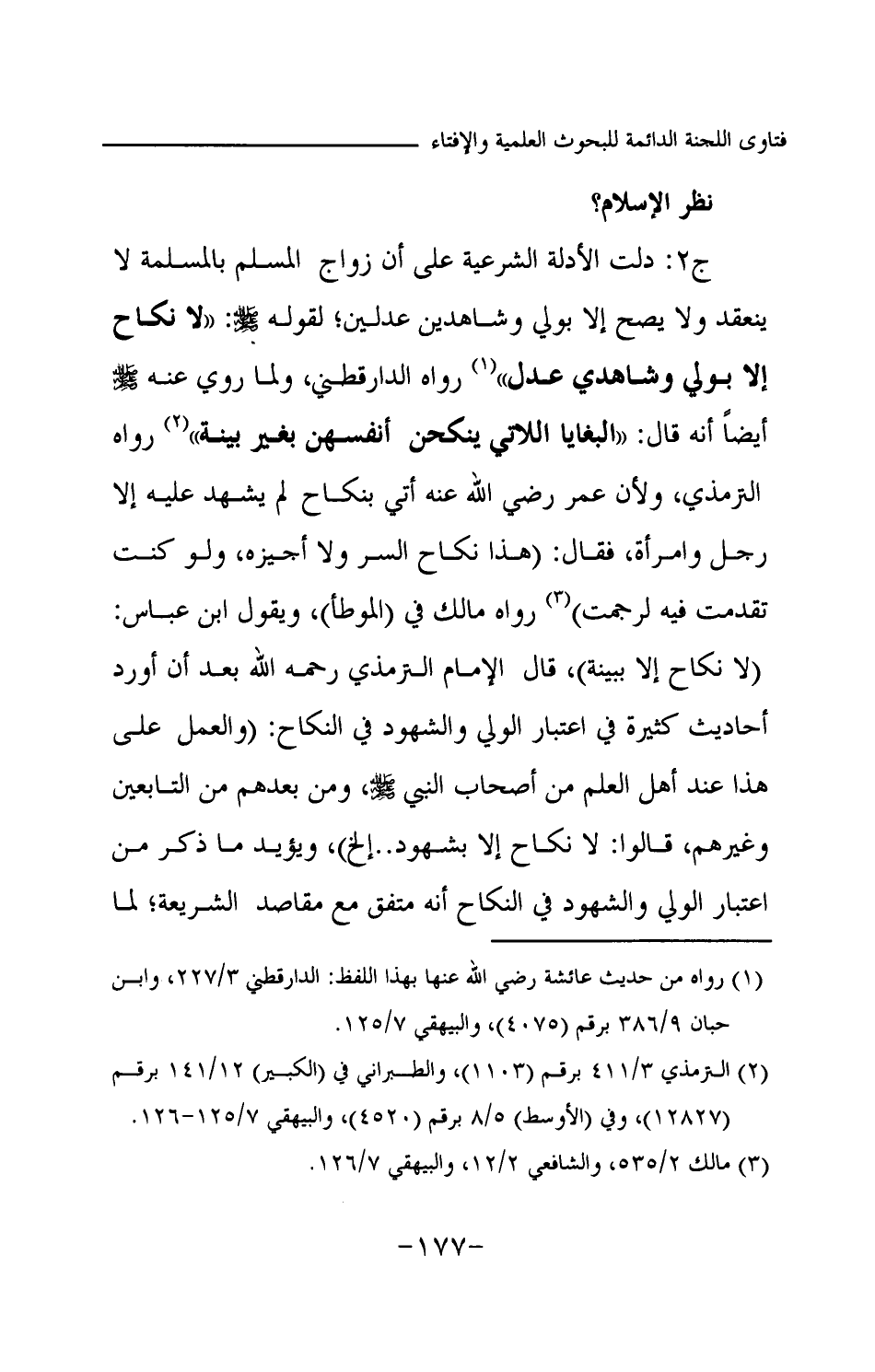ج2: دلت الأدلة الشرعية على أن زواج المسلم بالمسلمة لا ينعقد ولا يصح إلا بولي وشاهدين عدلين؛ لقوله -صلى الله عليه وسلم-: «لا نكاح إلا بولي وشاهدي عدل (¬1) » رواه الدارقطني ولما روي عنه -صلى الله عليه وسلم- أيضا أنه قال: «البغايا اللاتي ينكحن أنفسهن بغير بينة (¬2) » رواه الترمذي ولأن عمر رضي الله عنه أتي بنكاح لم يشهد عليه إلا رجل وامرأة، فقال: (هذا نكاح السر ولا أجيزه، ولو كنت تقدمت فيه لرجمت) (¬3) رواه مالك في (الموطأ) ويقول ابن عباس (لا نكاح إلا ببينة) . قال الإمام الترمذي رحمه الله بعد أن أورد أحاديث كثيرة في اعتبار الولي والشهود في النكاح: (والعمل على هذا عند أهل العلم من أصحاب النبي -صلى الله عليه وسلم- ومن بعدهم من التابعين وغيرهم، قالوا: لا نكاح إلا بشهود.. إلخ) ، ويؤيد ما ذكر من اعتبار الولي والشهود في النكاح أنه متفق مع مقاصد الشريعة؛ لما