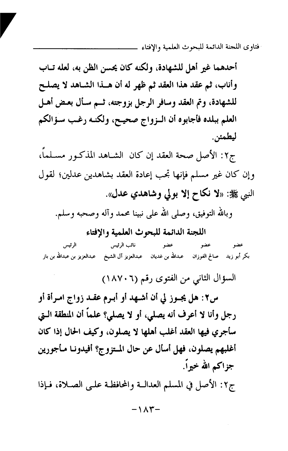 ج2: الأصل صحة العقد إن كان الشاهد المذكور مسلما، وإن كان غير مسلم فإنها تجب إعادة العقد بشاهدين عدلين؛ لقول النبي -صلى الله عليه وسلم-: «لا نكاح إلا بولي وشاهدي عدل (¬1) » وبالله التوفيق، وصلى الله على نبينا محمد وآله وصحبه وسلم.