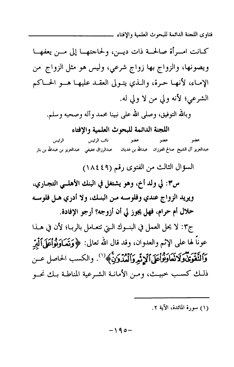 س3: لي ولد أخ، وهو يشتغل في البنك الأهلي التجاري، ويريد الزواج عندي وفلوسه من البنك، ولا أدري هل فلوسه حلال أم حرام، فهل يجوز لي أن أزوجه؟ أرجو الإفادة.