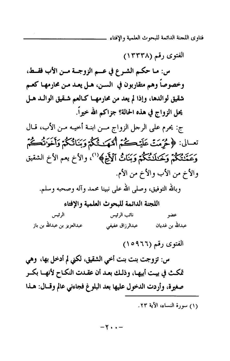 ج: يحرم على الرجل الزواج من ابنة أخيه من الأب، قال تعالى: {حُرِّمَتْ عَلَيْكُمْ أُمَّهَاتُكُمْ وَبَنَاتُكُمْ وَأَخَوَاتُكُمْ وَعَمَّاتُكُمْ وَخَالَاتُكُمْ وَبَنَاتُ الْأَخِ} (¬1) والأخ يعم الأخ الشقيق والأخ من الأب والأخ من الأم. وبالله التوفيق، وصلى الله على نبينا محمد وآله وصحبه وسلم.