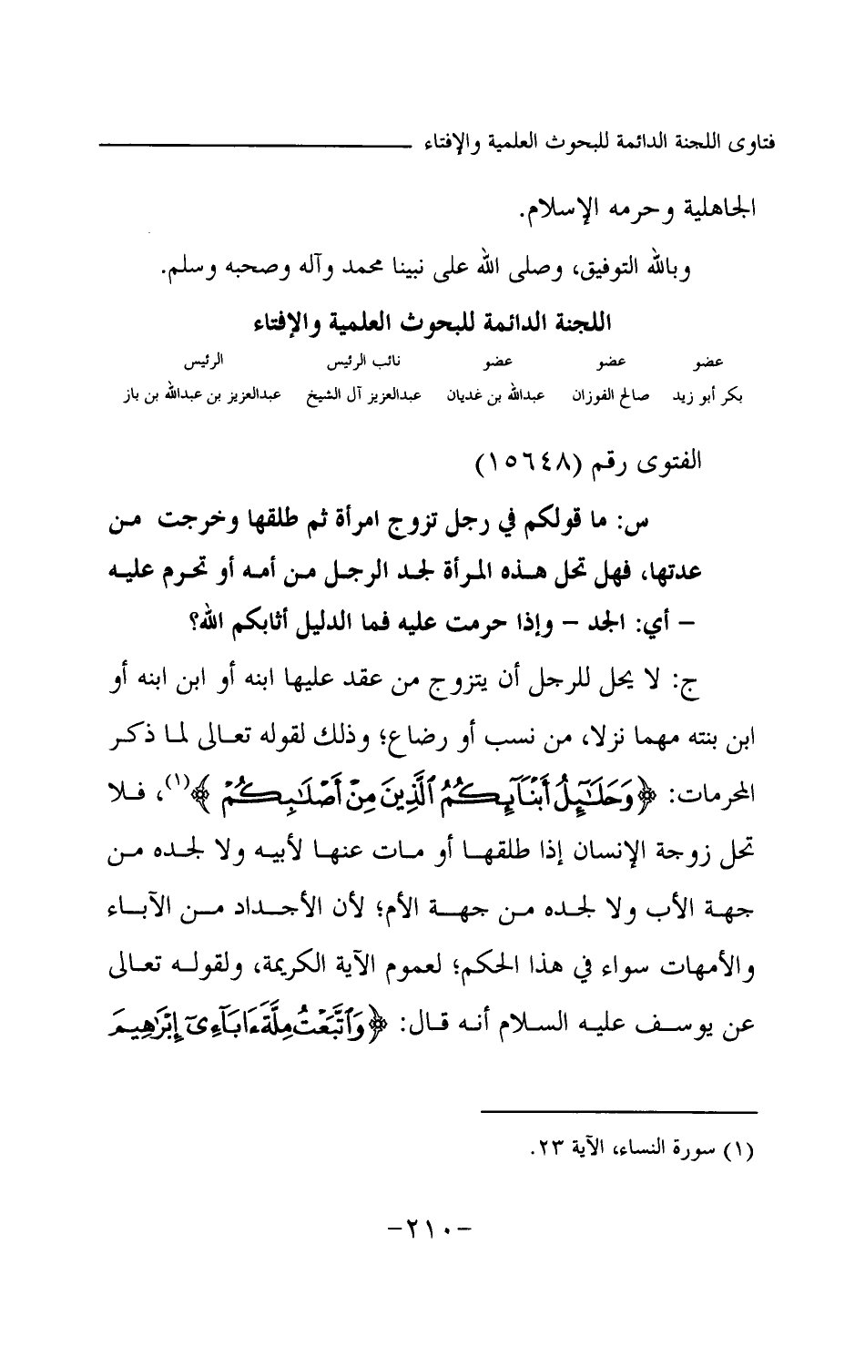 ج: لا يحل للرجل أن يتزوج من عقد عليها ابنه أو ابن ابنه أو ابن بنته مهما نزلا، من نسب أو رضاع؛ وذلك لقوله تعالى لما ذكر المحرمات: {وَحَلَائِلُ أَبْنَائِكُمُ الَّذِينَ مِنْ أَصْلَابِكُمْ} (¬1) فلا تحل زوجة الإنسان إذا طلقها أو مات عنها لأبيه ولا لجده من جهة الأب ولا لجده من جهة الأم؛ لأن الأجداد من الآباء والأمهات سواء في هذا الحكم؛ لعموم الآية الكريمة، ولقوله -تعالى- عن يوسف -عليه السلام- أنه قال: {وَاتَّبَعْتُ مِلَّةَ آبَائِي إِبْرَاهِيمَ وَإِسْحَاقَ وَيَعْقُوبَ} (¬2)