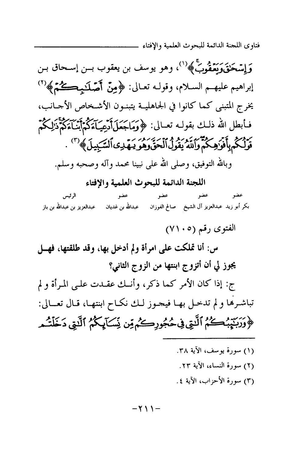 ج: إذا كان الأمر كما ذكر، وأنك عقدت على المرأة ولم تباشرها ولم تدخل بها فيجوز لك نكاح ابنتها، قال -تعالى-: {وَرَبَائِبُكُمُ اللَّاتِي فِي حُجُورِكُمْ مِنْ نِسَائِكُمُ اللَّاتِي دَخَلْتُمْ بِهِنَّ فَإِنْ لَمْ تَكُونُوا دَخَلْتُمْ بِهِنَّ فَلَا جُنَاحَ عَلَيْكُمْ} (¬1)
