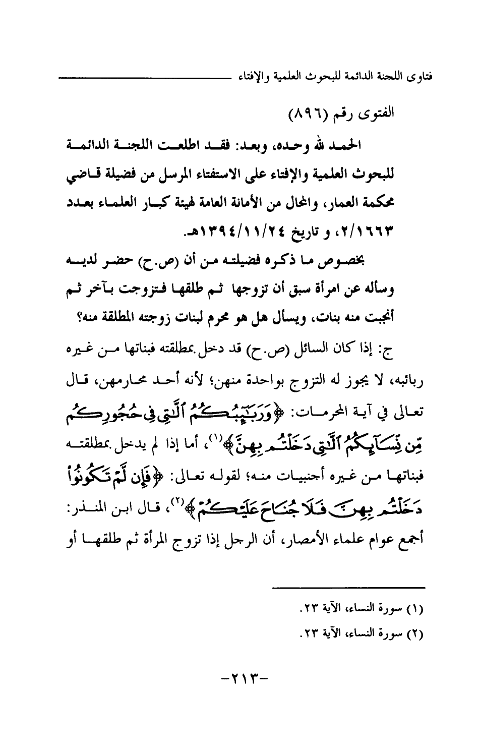 الحمد لله وحده، وبعد: فقد اطلعت اللجنة الدائمة للبحوث العلمية والإفتاء على الاستفتاء المرسل من فضيلة قاضي محكمة العمار، والمحال من الأمانة العامة لهيئة كبار العلماء بعدد 1663 \ 2، وتاريخ 24 \ 11 \ 1394 هـ.
