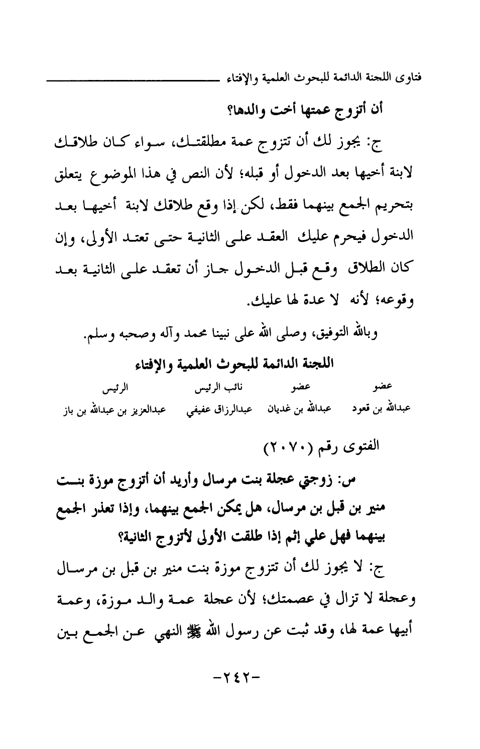 ج: لا يجوز لك أن تتزوج موزة بنت منير بن قبل بن مرسال وعجلة لا تزال في عصمتك؛ لأن عجلة عمة والد موزة، وعمة أبيها عمة لها، وقد ثبت عن رسول الله -صلى الله عليه وسلم- النهي عن الجمع بين
