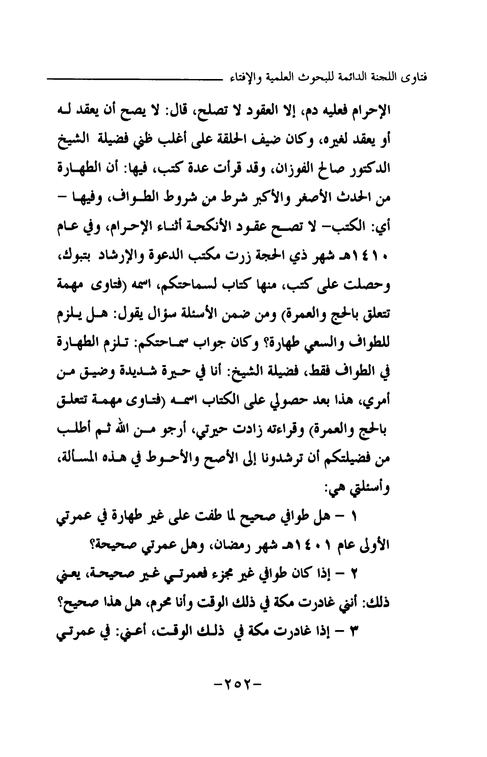وفي عام 1410 هـ شهر ذي الحجة زرت مكتب الدعوة والإرشاد بتبوك وحصلت على كتب، منها كتاب لسماحتكم، اسمه (فتاوى مهمة تتعلق بالحج والعمرة) ومن ضمن الأسئلة سؤال يقول: هل يلزم للطواف والسعي طهارة؟ وكان: جواب سماحتكم: تلزم الطهارة في الطواف فقط، فضيلة الشيخ: أنا في حيرة شديدة وضيق من أمري، هذا بعد حصولي على الكتاب اسمه (فتاوى مهمة تتعلق بالحج والعمرة) وقراءته زادت حيرتي، أرجو من الله ثم أطلب من فضيلتكم أن ترشدونا إلى الأصح والأحوط في هذه المسألة، وأسئلتي هي: 1- هل طوافي صحيح لما طفت على غير طهارة في عمرتي الأولى عام 1401 هـ شهر رمضان، وهل عمرتي صحيحة؟ 2- إذا كان طوافي غير مجزئ فعمرتي غير صحيحة، يعني ذلك: أنني غادرت مكة في ذلك الوقت وأنا محرم، هل هذا صحيح؟