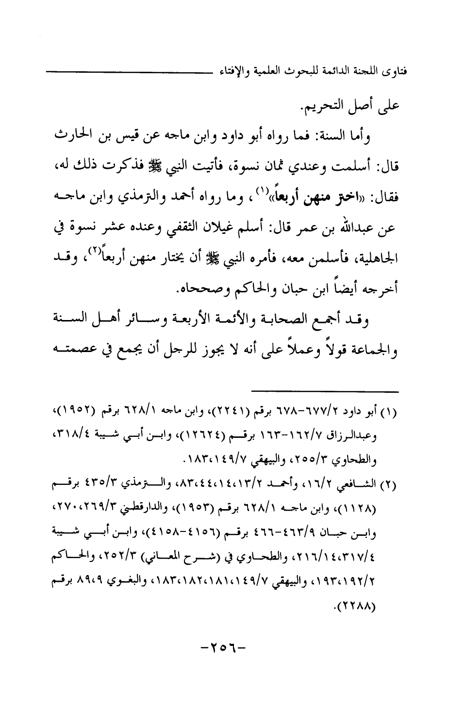 على أصل التحريم. وأما السنة: فما رواه أبو داود وابن ماجه عن قيس بن الحارث قال: «أسلمت وعندي ثمان نسوة، فأتيت النبي -صلى الله عليه وسلم- فذكرت ذلك له، فقال: اختر منهن أربعا (¬1) » وما رواه أحمد والترمذي وابن ماجه عن عبد الله بن عمر قال: «أسلم غيلان الثقفي وعنده عشر نسوة في الجاهلية، فأسلمن معه، فأمره النبي أن يختار منهن أربعا (¬2) » وقد أخرجه أيضا ابن حبان والحاكم وصححاه. وقد أجمع الصحابة والأئمة الأربعة وسائر أهل السنة والجماعة قولا وعملا على أنه لا يجوز للرجل أن يجمع في عصمته