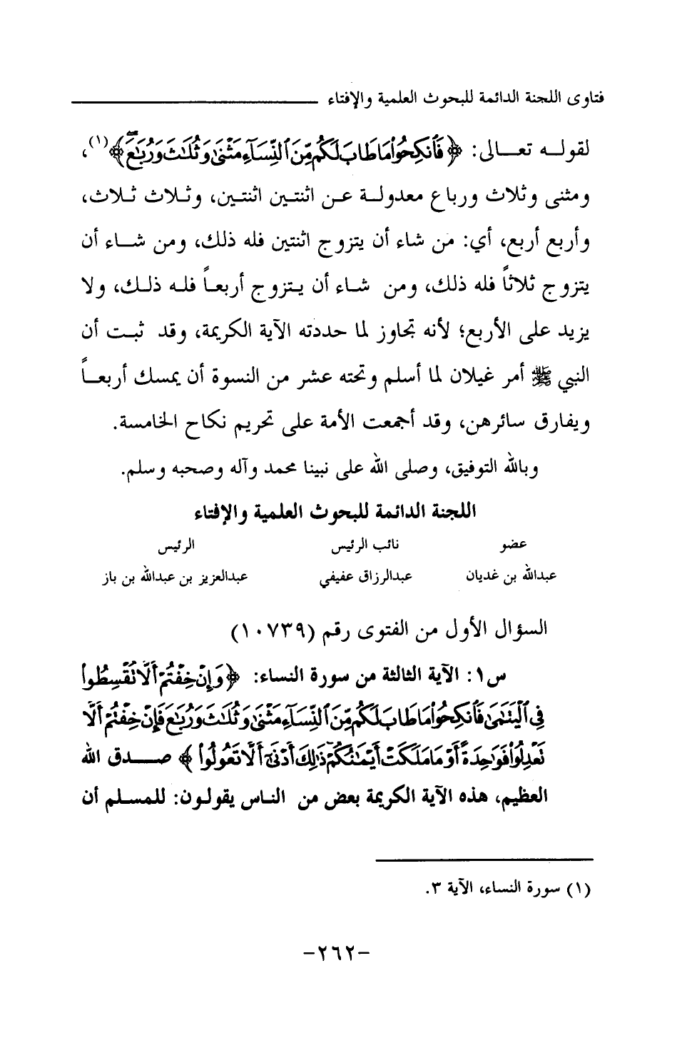 س1: الآية الثالثة من سورة النساء: {وَإِنْ خِفْتُمْ أَلَّا تُقْسِطُوا فِي الْيَتَامَى فَانْكِحُوا مَا طَابَ لَكُمْ مِنَ النِّسَاءِ مَثْنَى وَثُلَاثَ وَرُبَاعَ فَإِنْ خِفْتُمْ أَلَّا تَعْدِلُوا فَوَاحِدَةً أَوْ مَا مَلَكَتْ أَيْمَانُكُمْ ذَلِكَ أَدْنَى أَلَّا تَعُولُوا} (¬1) صدق الله العظيم، هذه الآية الكريمة بعض من الناس يقولون: للمسلم أن
